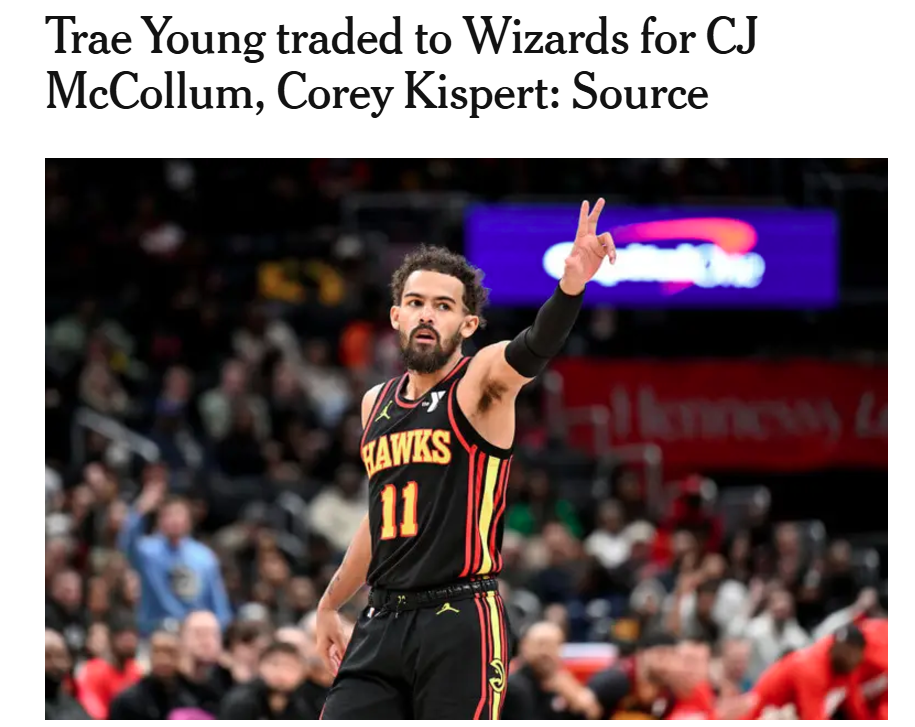 根据ESPN名记Shams报道,老鹰与奇才围绕特雷杨与CJ正式达成一笔2换1交易,具体内容如下: