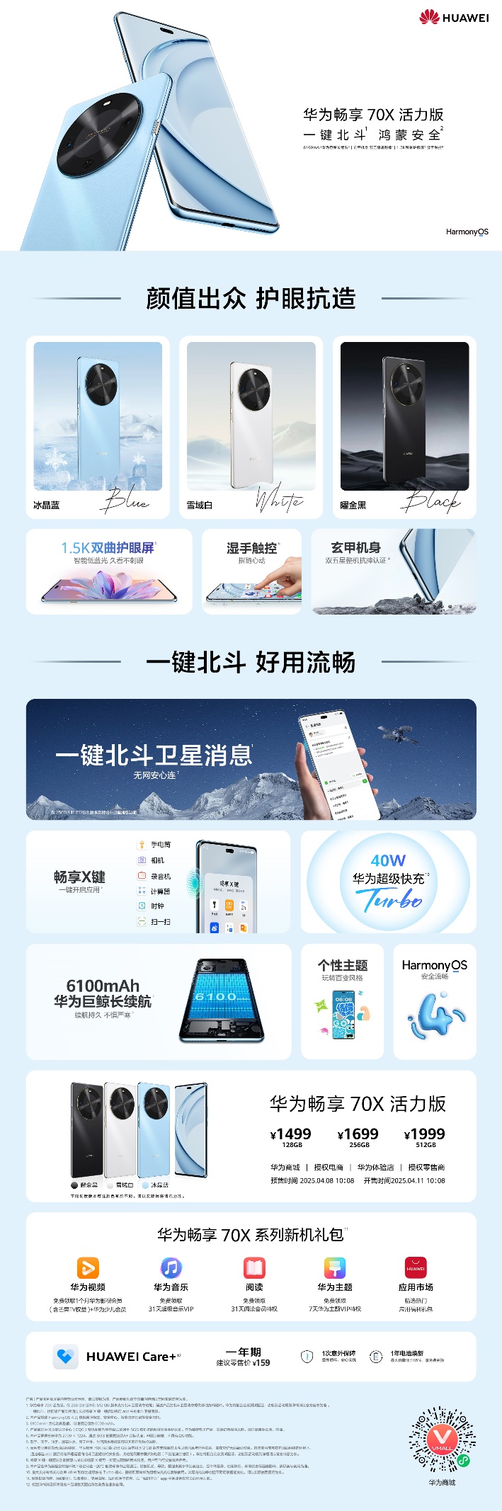 总而言之,不管是通信、续航还是颜值、安全,华为畅享 70X活力版都有着可圈可点的表现,完全对得起“千元全能的北斗鸿蒙手机”称号。无论自用还是送给家中父母长辈,它都是非常不错的选择。据悉,华为畅享 70X活力版起售价为1499元,国补最高直降300元,最低到手价1274元起。不仅如此,2025年4月11日至2025年5月11日,华为畅享 70X 活力版新机用户,可通过我的华为app-新机权益-华为畅享 70X系列新机礼包-畅享无忧大礼包领取礼遇,包含延长1年保修和1年电池焕新,更多服务权益详情可通过我的华为app-服务-权益查询了解。