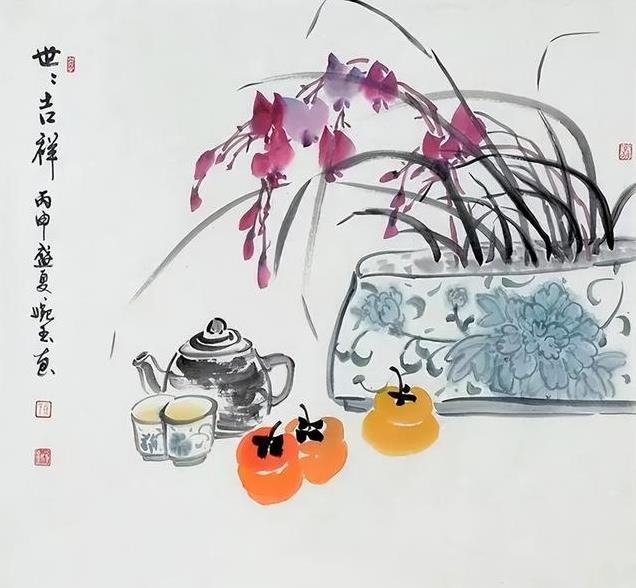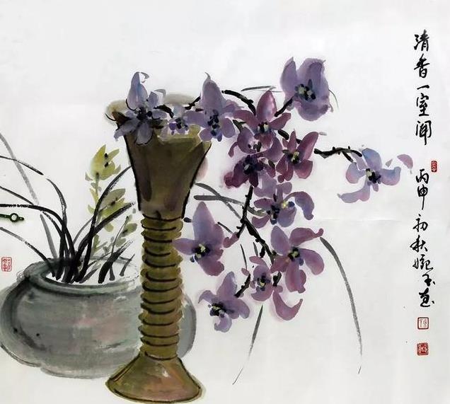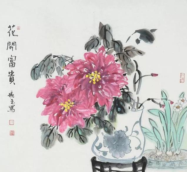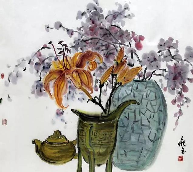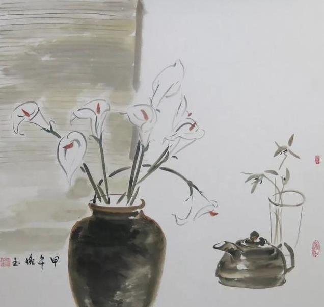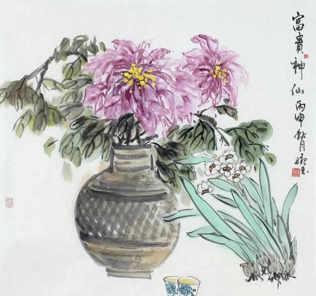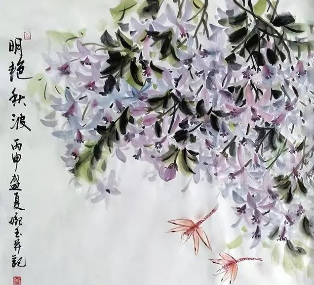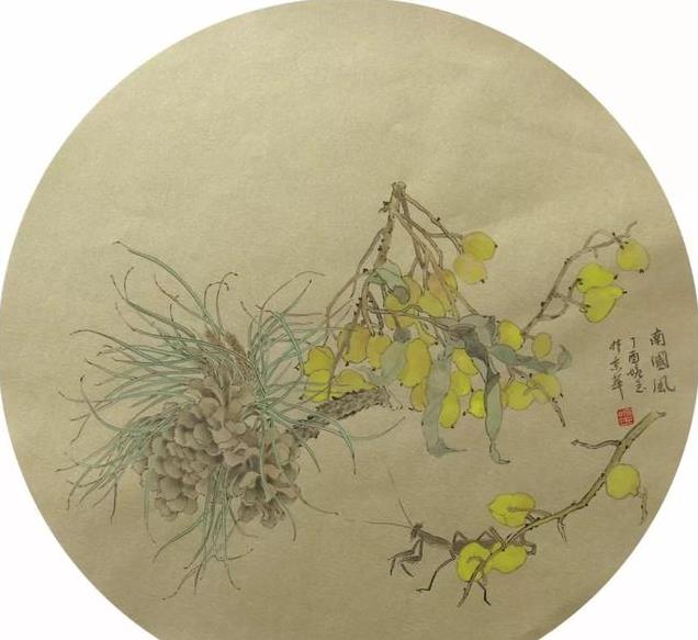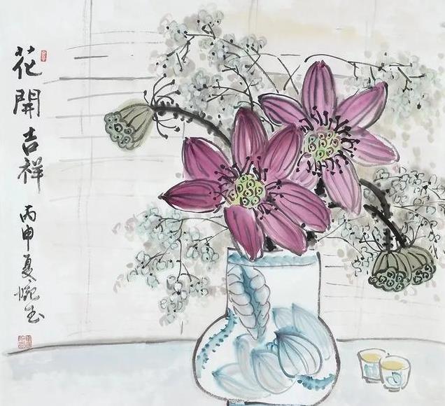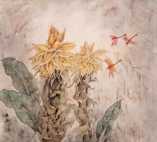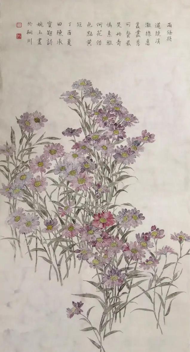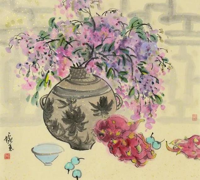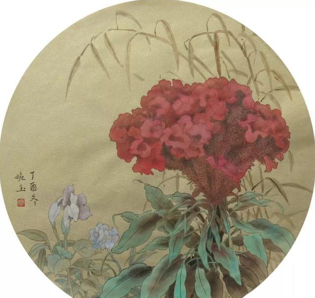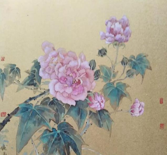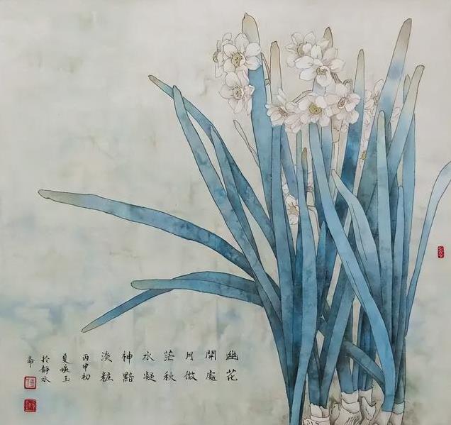 她以书法的笔意勾线造型,使用“三矾九染”,也使用“平涂填色”渲染填色交替互用互补,时而厚涂,时而薄罩,丰富的技法语言,增加艺术的表现力度。