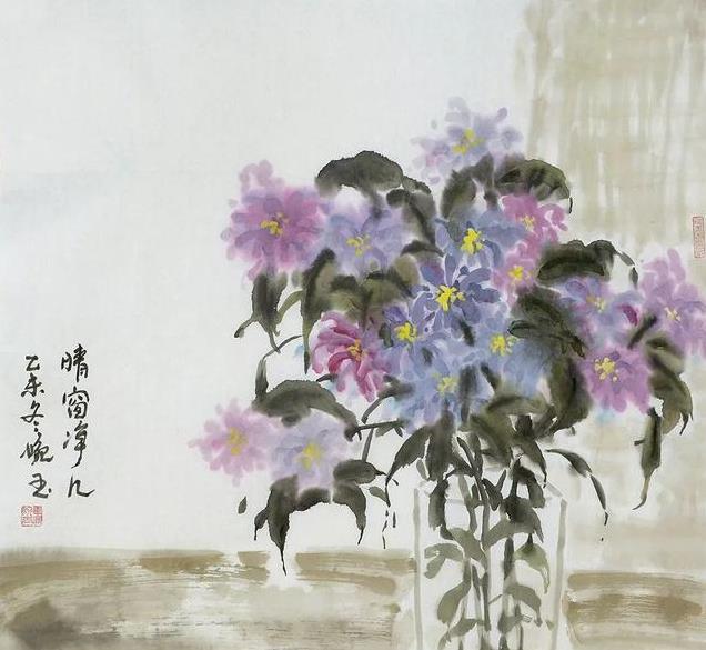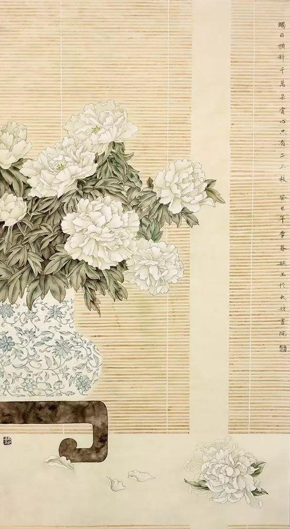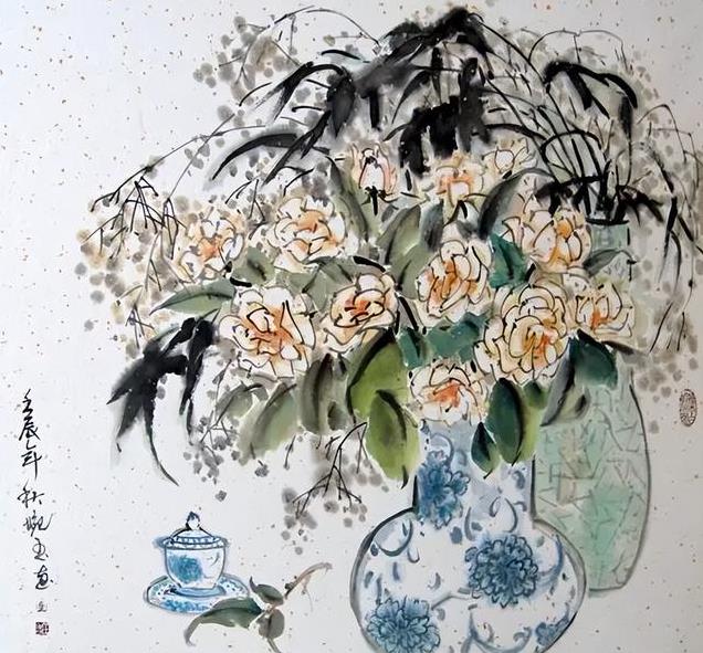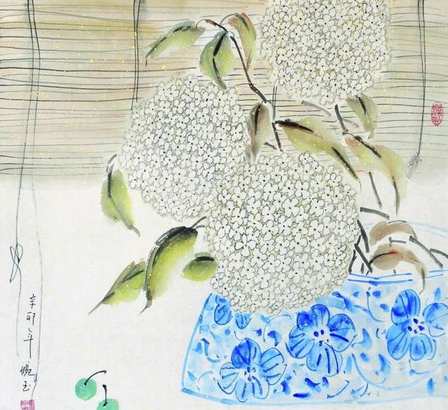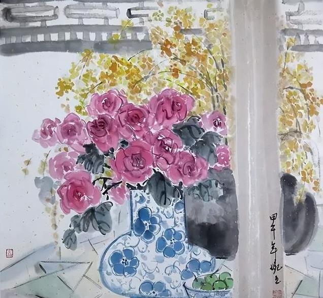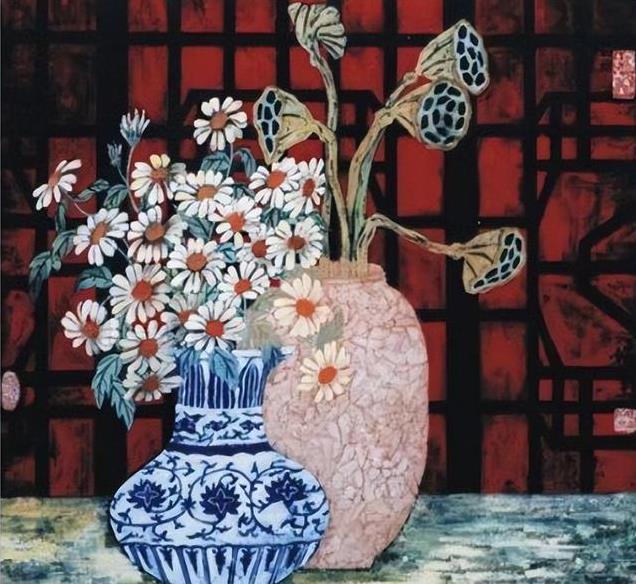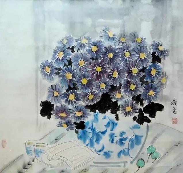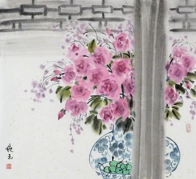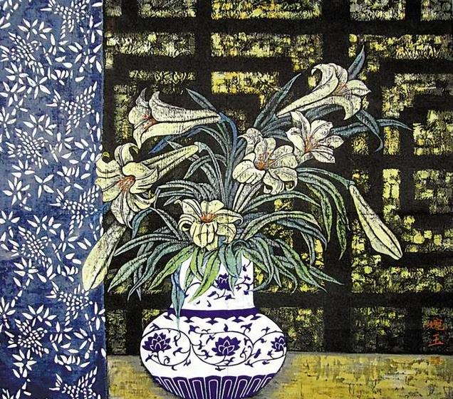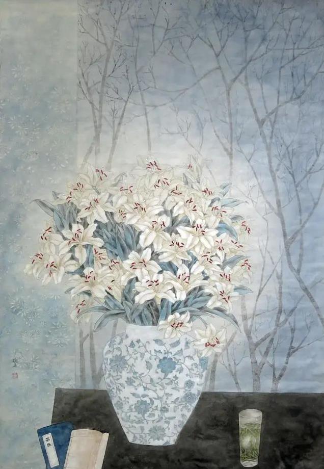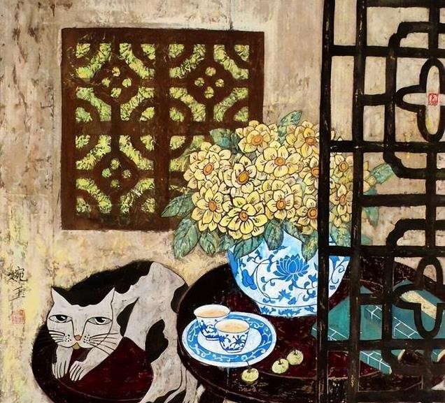 马婉玉的作品变化多样,她那清雅澹静作品也十分凝重厚实,高调中蕴含着古味斑驳的肌理效果。画中多以青花古瓶、青花瓷器与古民居中的窗格图案、蓝印花布、红木家俱组成一体,运思巧妙,构成新颖,将生机勃勃的花鸟、郁郁葱葱的盆栽点缀在幽闲静谧的氛围中,激活画面。