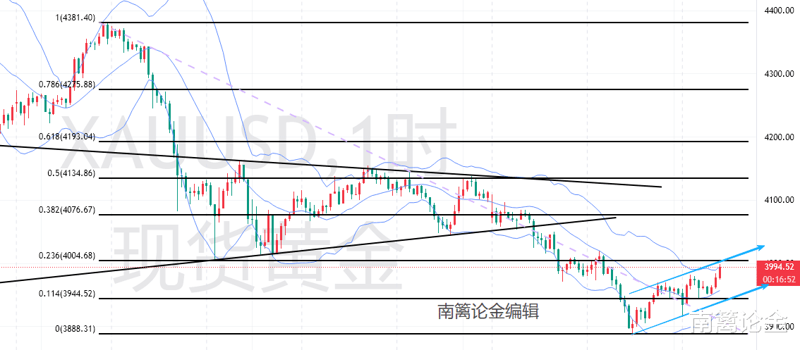 短周期中,昨天直播的时候就说到上方的阻力是50~66,确实是压下来了一次。凌晨的时候往下压到17做反弹,连接低点,其实可以当成一个上涨通道。下轨是在3930—35区域,上方的话,在今天的指南文章中跟各位去写到了,要去关注4004~4016一带。