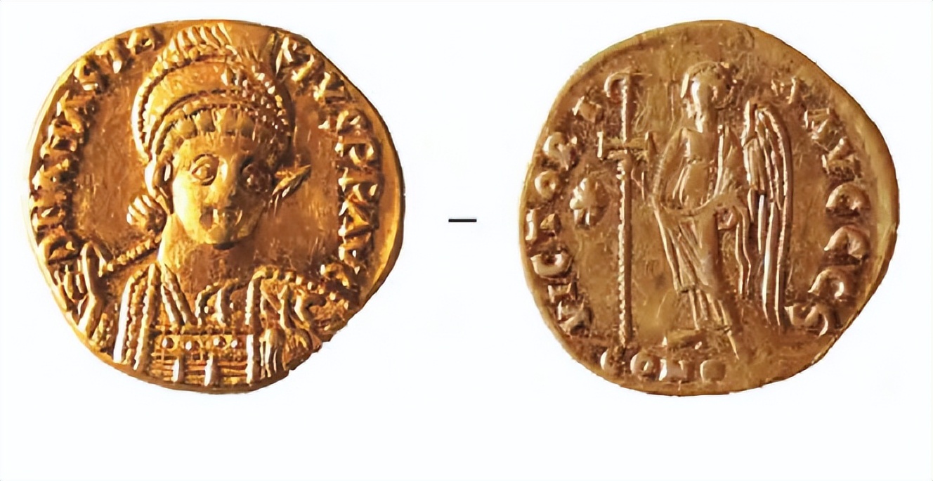 这枚金币正面,皇帝手持的不是长矛,而是十字架——这是查士丁尼一世时期才出现的特征。但它又保留了阿纳斯塔修斯一世的侧影特点。背面带翼天使体态健硕,似为男性,而查士丁一世时期的天使明显是女性形象。