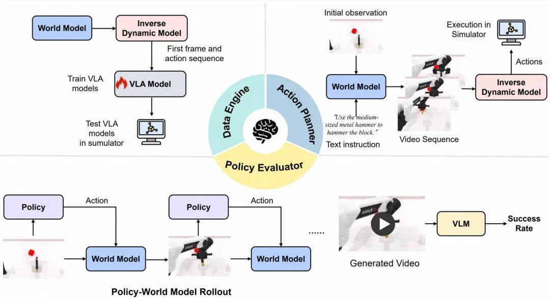 赛道二为具身任务功能性赛道。这是 WorldArena 的核心创新方向,首次将评测延伸至真实的具身任务执行层面,围绕世界模型在具身智能中的三大核心使用价值展开评估:作为数据合成引擎,能否生成有效提升策略模型性能的合成数据;作为策略评估器,能否替代物理仿真器准确评估策略;作为行动规划器,能否直接规划出可执行的动作序列。赛道二将率先开放数据合成引擎与策略评估器的提交通道,对于排名靠前的方案,后续将引入行动规划器进行额外加权打分,以全面验证模型的实用价值。