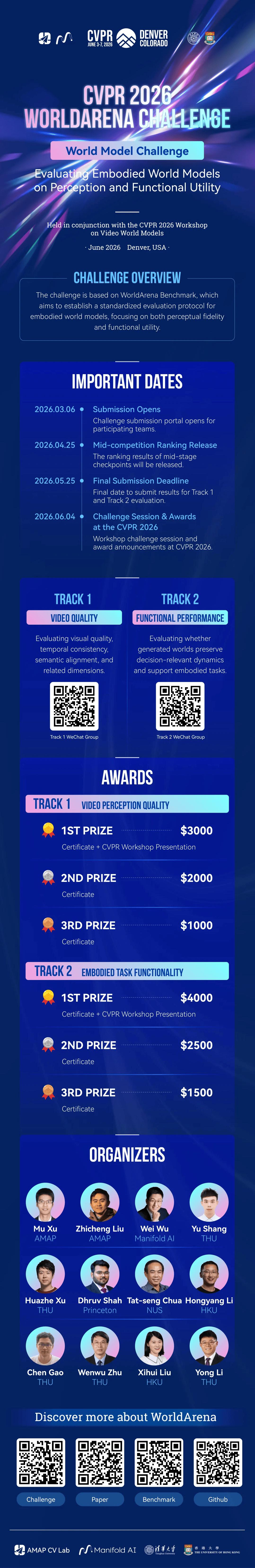 WorldArena Challenge 是依托 CVPR 2026 Video World Model Workshop 举办的国际挑战赛,由高德地图视觉技术中心(AMAP CV Lab)、流形空间(Manifold.ai)和清华大学牵头,联合普林斯顿大学、新加坡国立大学、香港大学等全球顶尖学术机构共同主办。