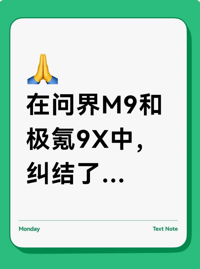 家里的油车开腻了,想再买台新能源,看了问界M9和极氪9X!朋友推荐问界M9,背靠华为,有品牌支撑。