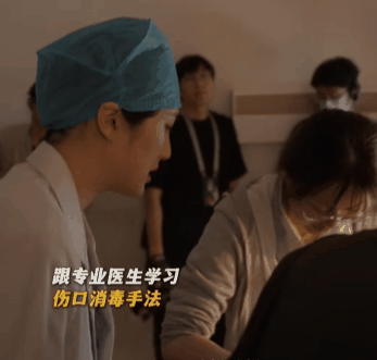 戏外她认真听导演的讲解,还向专业医生学习伤口消毒手法,片场中随时随地拿着道具进行练习。