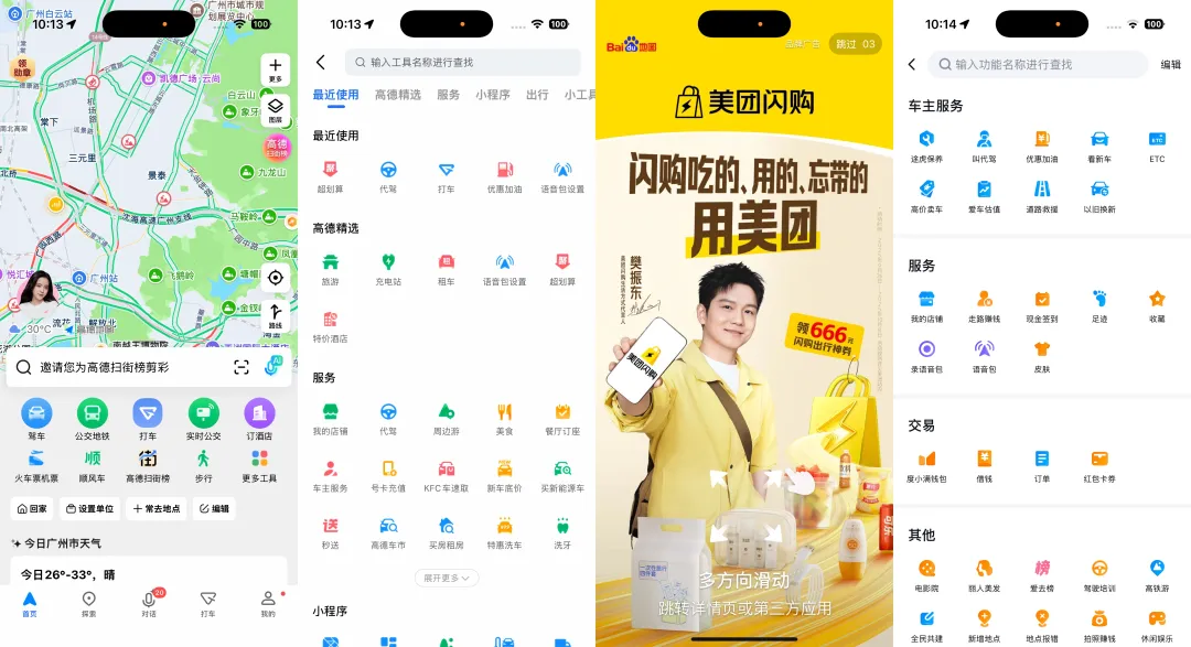 比如,高德地图开屏很快,但是界面上不仅有两个高德扫街榜的入口,还有打车、订酒店、火车票机票甚至天气的板块;