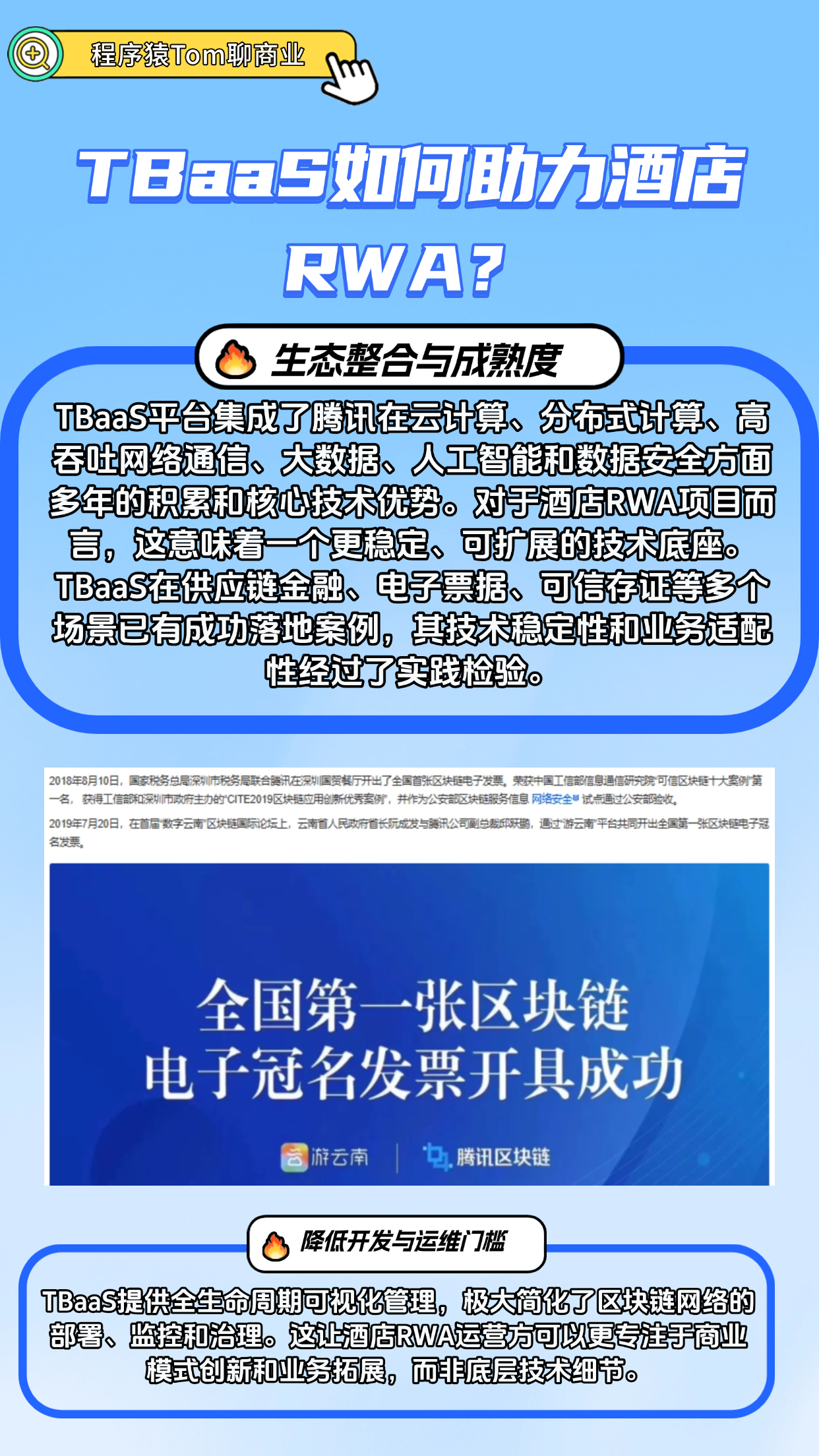 腾讯云TBaaS通过区块链技术助力酒店实现RWA(实物资产数字化),将客房使用权等转化为链上数字权益凭证(如NFG),降低投资门槛并提升流动性。TBaaS提供可信上链、智能合约自动化、金融级安全及隐私保护,构建透明分润体系,破解酒店业重资产运营困境,实现轻资产转型。
