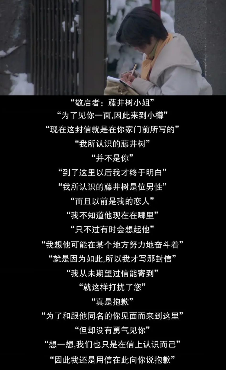 没有轰轰烈烈的爱情、没有翻云覆雨的激爱戏码,甚至你连看见男女主角谈情说爱都没有,一切就像电影选用雪作为主场景那样,如雪那样纯粹、雪白,仅仅透过两个彼此陌生、却都对男主角有着共同回忆的女子,去带出、拼凑属于印象中那个人的完整面貌,也挖掘出彼此深埋在心中已久的过往,书信的一来一往,完整了这部电影,没有复杂的剧情场景、拍摄手法,却让观众从中感受到初恋的甜蜜、苦涩、忧伤,还有、遗憾。