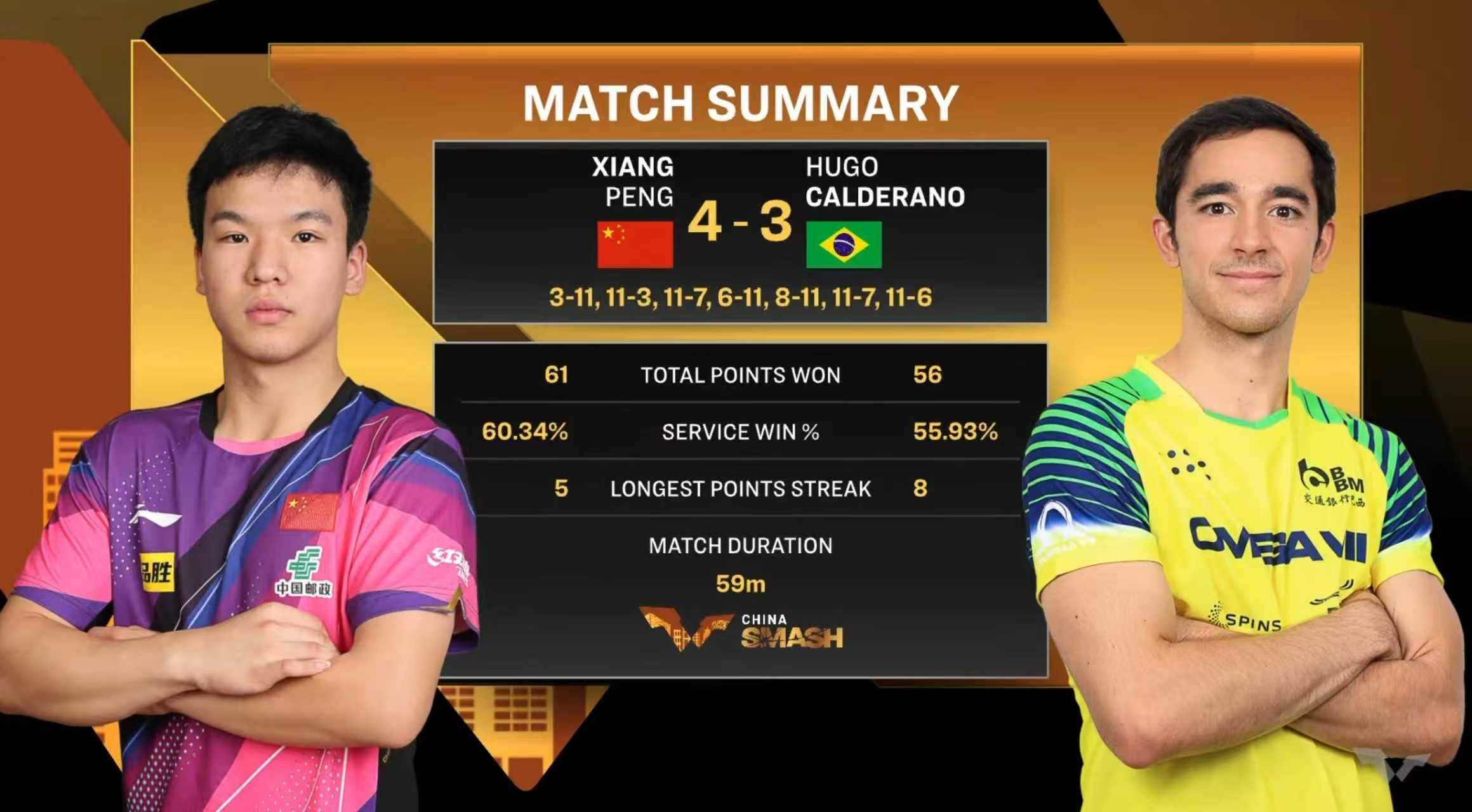关键的第六局,向鹏顶住压力,以11-7拿下,将比赛拖入决胜局。决胜局中,向鹏保持专注,以11-6锁定胜局,最终大比分4-3逆转晋级。这是向鹏继仁川冠军赛后再次战胜雨果,创造个人在WTT大满贯赛事的最好成绩。