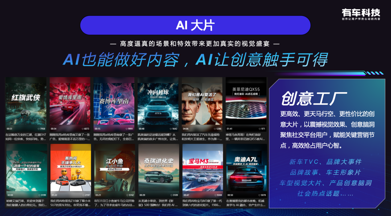 有车科技创始人、CEO徐晨华介绍,使用自研的支持自然语言交互的多模态生成查询工具“有车AI创作助手”,依托丰富的汽车垂类知识图谱,可以支持3秒快速生成汽车创意内容脚本,缩短80%创作周期,编剧成本降低90%以上。在演员与拍摄、场景搭建、多语言配音、后期制作等环节,都有7-10倍的降本空间。