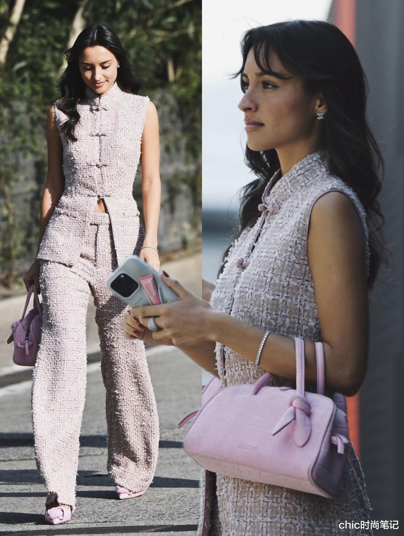 把小香风套装和旗袍元素相结合,穿搭思路格局打开。无袖立领的上衣搭配同系列长裤,带着优雅与知性的同时又能拥有东方韵味。