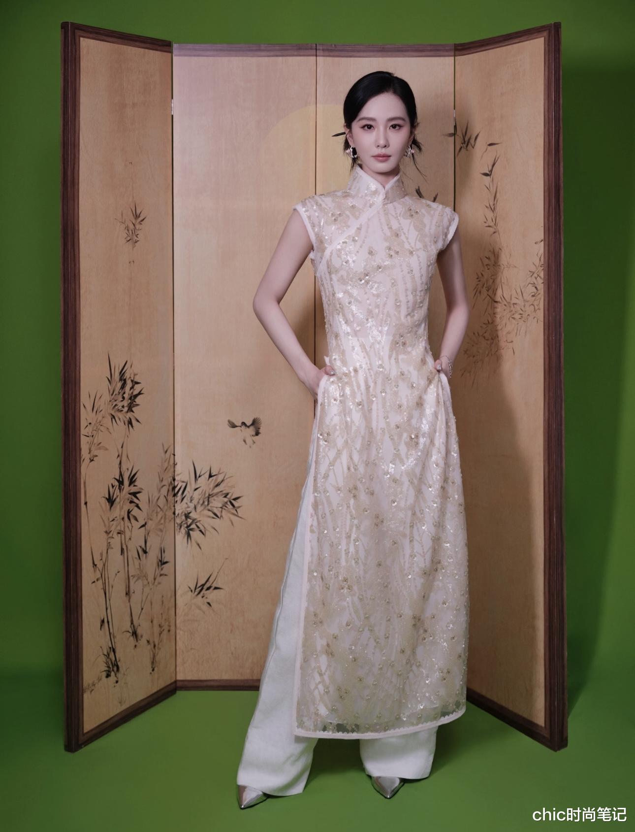 刘诗诗则是用旗袍进行叠穿,略显宽松的旗袍上点缀着精致串珠,搭配一条白色长裤,让穿搭不那么温柔,增加了休闲与随性的空间。