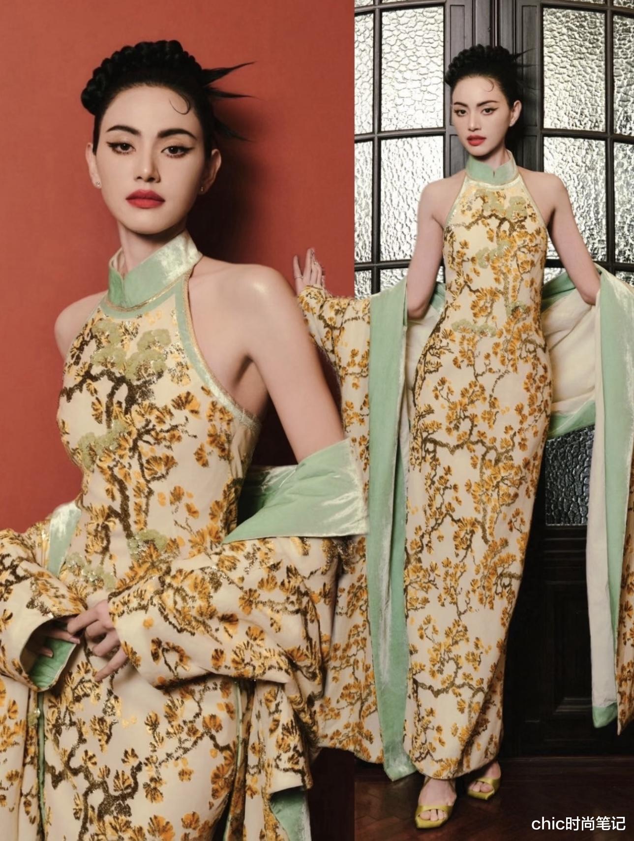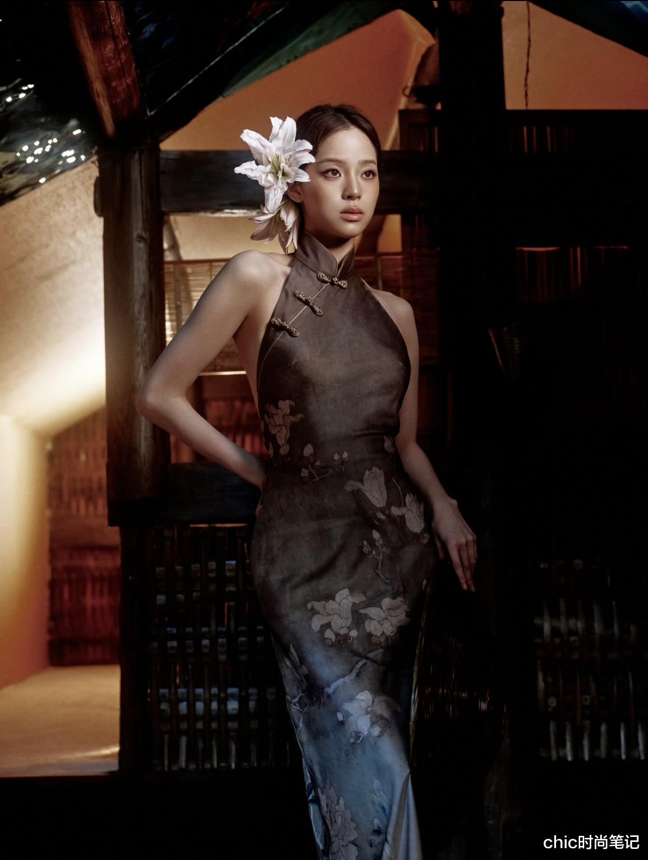 国内非常多的女星也身穿旗袍出席活动。欧阳娜娜一袭茶色挂脖旗袍展现优雅与高级,裙身的玉兰花傲然挺立,与花朵发饰有效融合了。