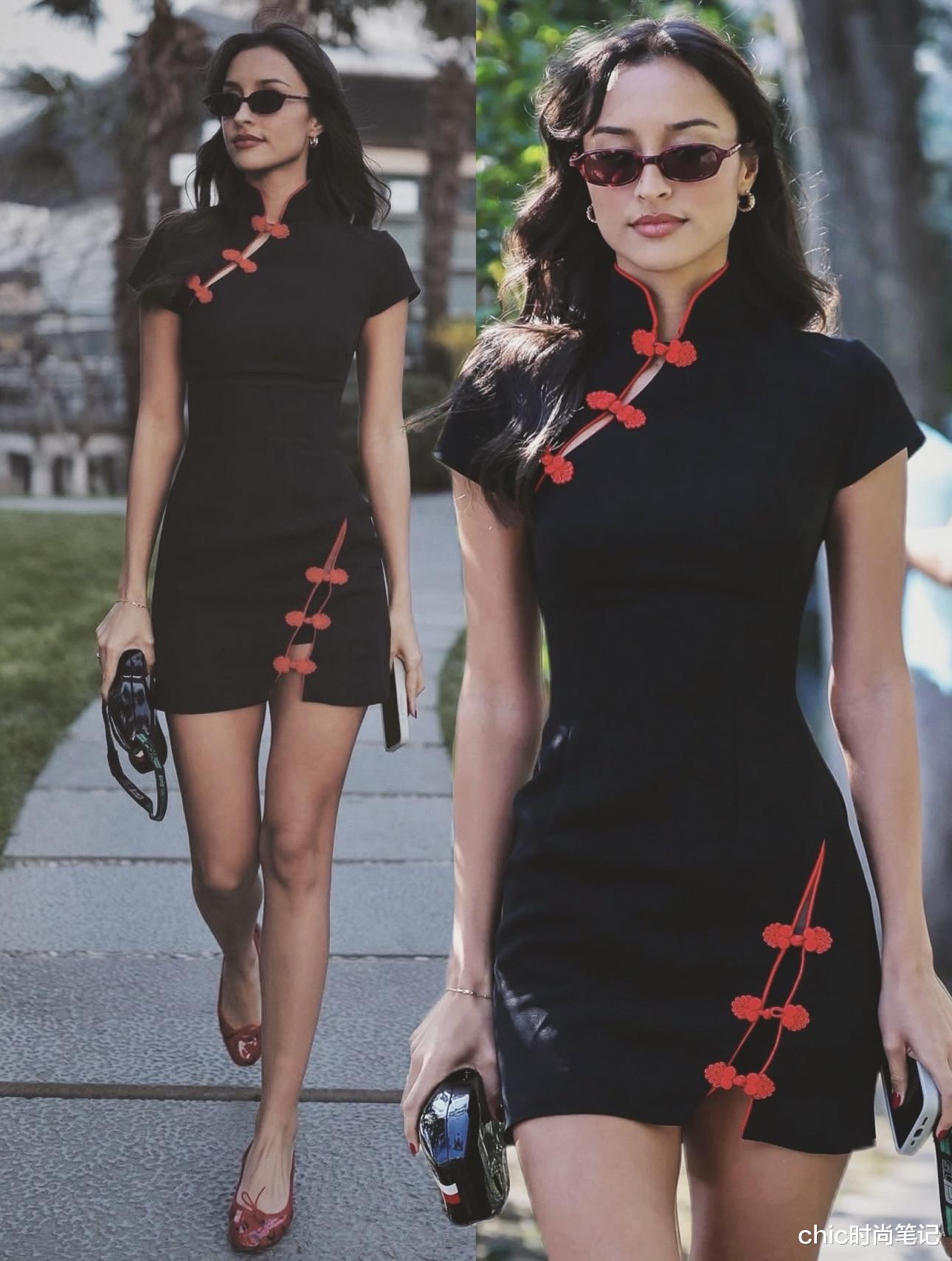 黑色旗袍搭配红色盘扣,领口与裙摆开叉处都设计了盘扣,把中国的对称美学玩到极致,也同样选择了修身短款,展现身材比例。