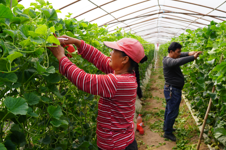 “掐掉多余瓜蔓,就是不让它‘抢饭吃’,养分才能集中供到瓜上。”种植户缑红利和丈夫贾秀娃穿梭在瓜垄间,忙着为二茬甜瓜整蔓、授粉。