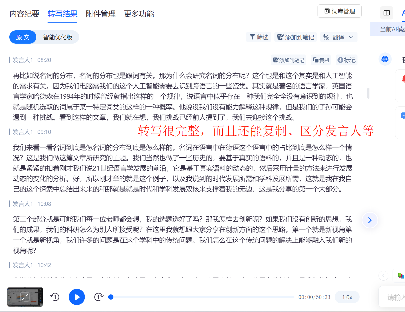 例如在教育培训场景中,上周我去参加行业课程,授课老师是四川人,在讲解 “机器学习模型要迭代三次才会收敛” 时,豆包将其转写成了 “叠带三次才会收脸”,当时我在笔记上画了个大大的问号。随后我使用听脑 AI 重新转写,“迭代”“收敛” 这两个专业词汇被直接准确识别出来,丝毫没有受到老师四川口音的影响。