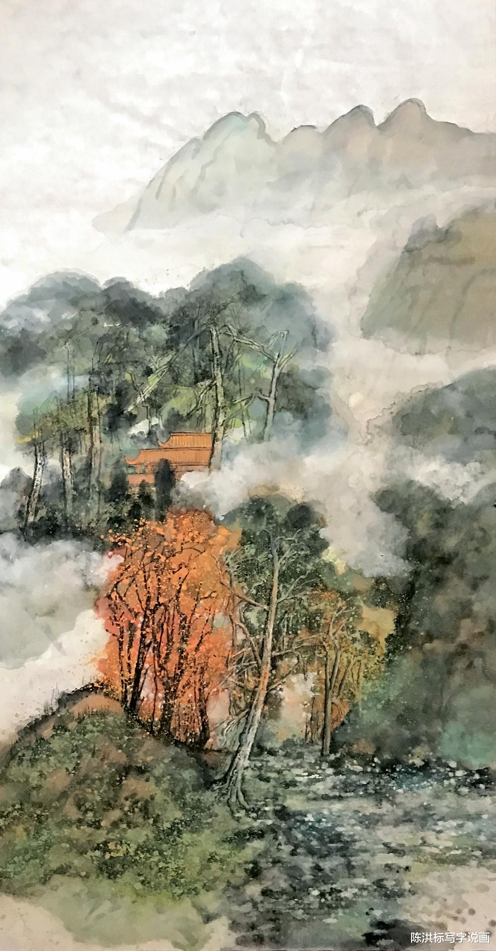 陈建锋写古柏苍松,遒劲老辣,尽显笔力;写远山云海,飘逸细腻,又尽显意境,两者结合竟然互为映衬,浑然天成,让古寺名刹的萧穆庄重、凝重恬静的气氛溢于画面,而四处弥漫。如此生动笔墨、渲染技法成为他的山水写生的一大特色。山水画中的设色,丰富而不杂乱,更不艳俗,别有一番温和柔美之风。