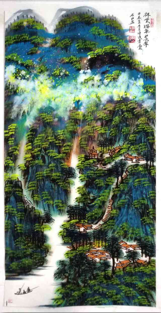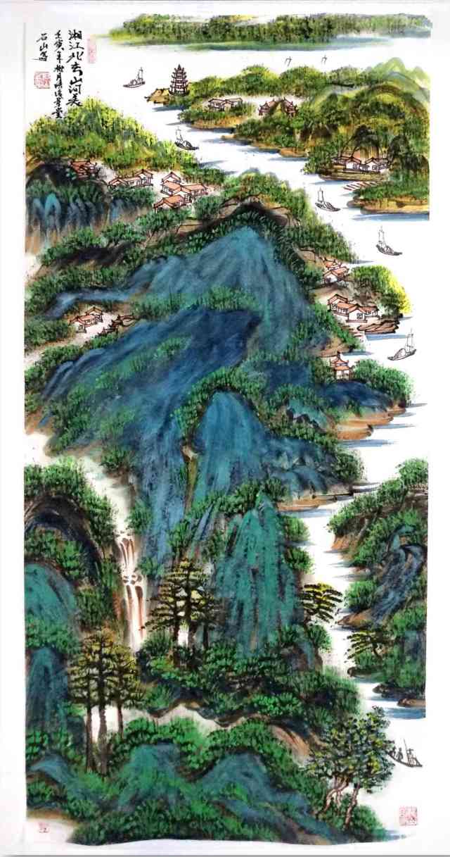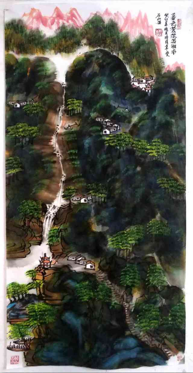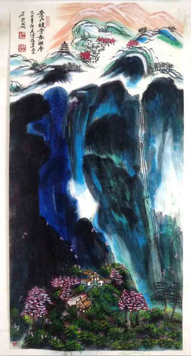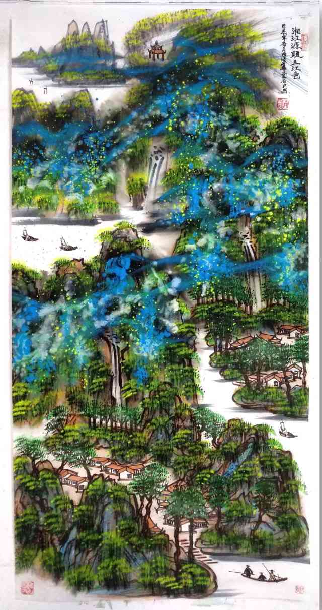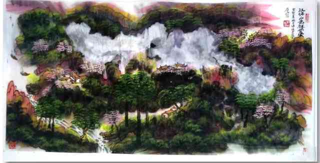 画家作画,是为自己心灵留影。谢石山的春染江南系列所描绘的山水世界,通过不断反复超越自己的写意,表现幽绝的墨色氤氲色彩境界,将山水画的程式融入泼墨、泼彩、破墨与干笔皴擦、湿笔渲染等笔墨语言,综合呈现了缤纷多彩的艺术形象。画家对传统山水画的苦苦追求,通过画笔体现的禅意“无相法门,无我无法”,让时空追求超越永恒的内涵,达到了惊人心魄的视角冲击力,它体现的现代艺术是中国的、也是世界的。