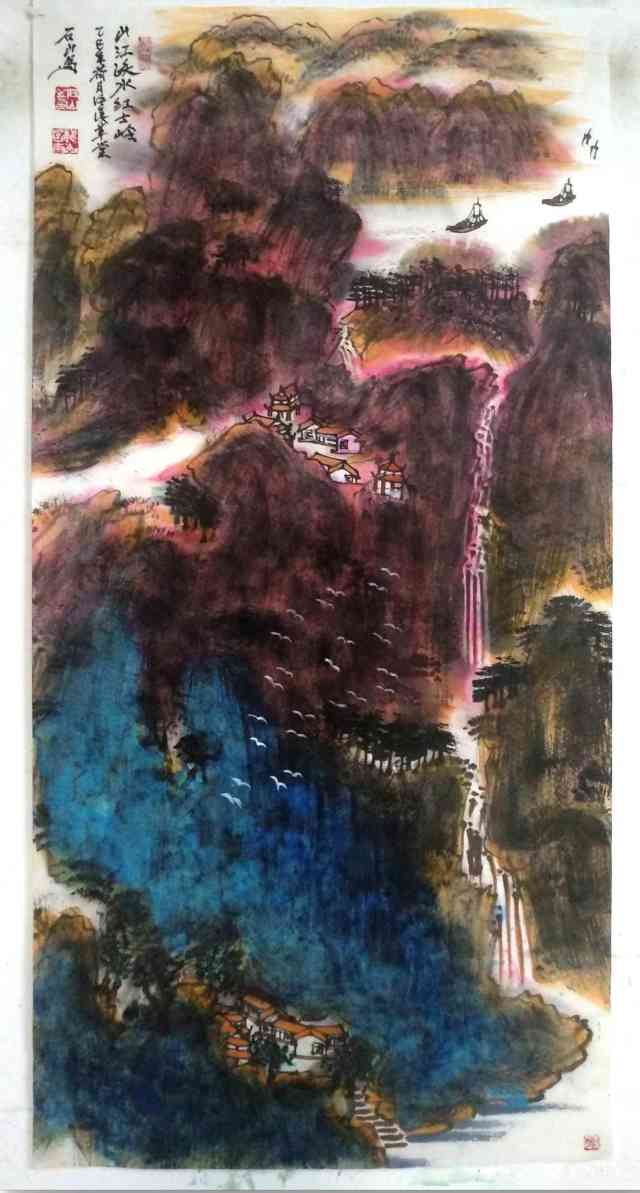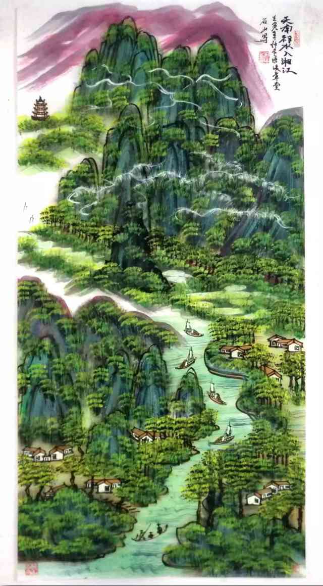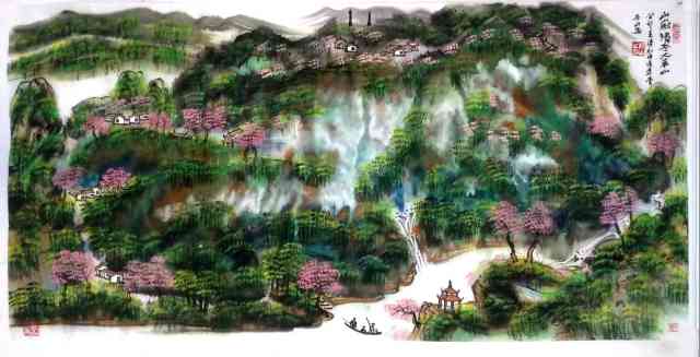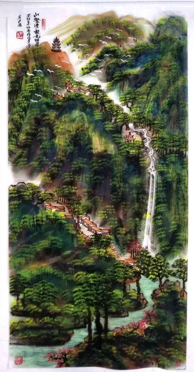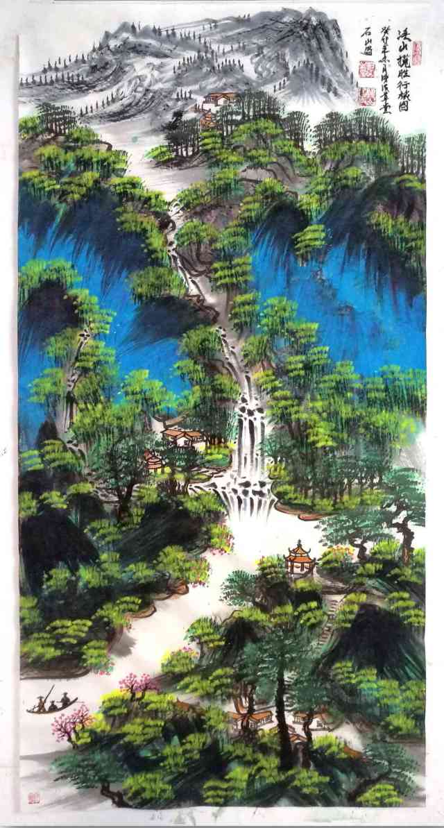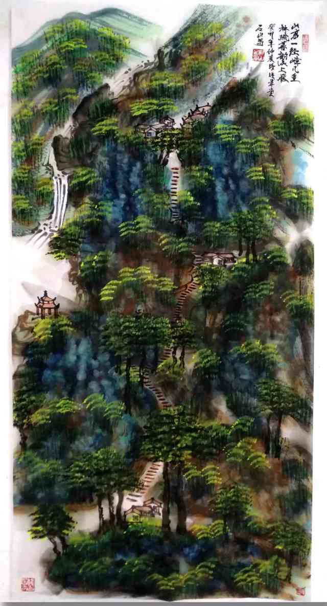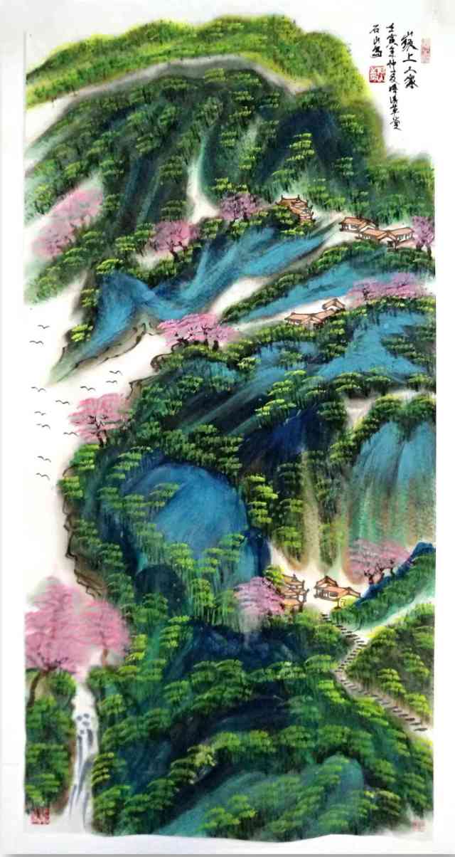 画家作画,是为自己心灵留影。谢石山的春染江南系列所描绘的山水世界,通过不断反复超越自己的写意,表现幽绝的墨色氤氲色彩境界,将山水画的程式融入泼墨、泼彩、破墨与干笔皴擦、湿笔渲染等笔墨语言,综合呈现了缤纷多彩的艺术形象。画家对传统山水画的苦苦追求,通过画笔体现的禅意“无相法门,无我无法”,让时空追求超越永恒的内涵,达到了惊人心魄的视角冲击力,它体现的现代艺术是中国的、也是世界的。