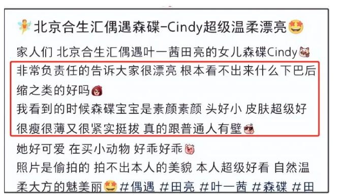 事实上,森碟并非首次因面部特征引发关注。早在她小时候,就有网友注意到其下巴线条异常。而此次事件之所以再次激起公众情绪,一方面是因为她的成长备受瞩目,另一方面也与田亮夫妇过往的一些言论和行为有关。例如,叶一茜曾在社交媒体上发表过一些被认为带有性别偏见的内容,导致部分网友对她在育儿方面的态度产生质疑。