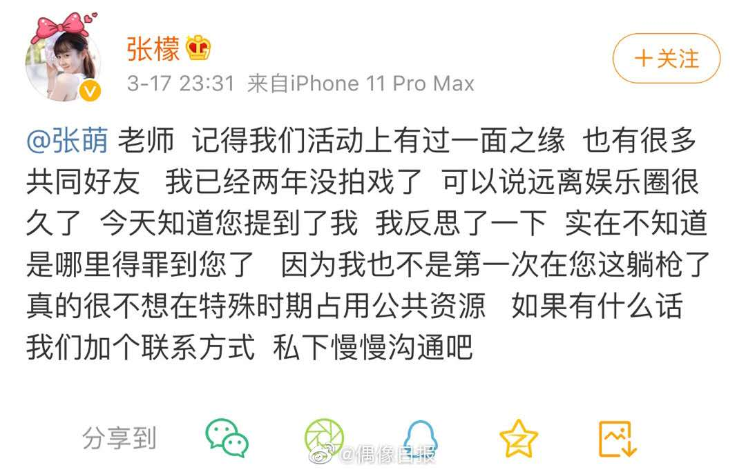 。随后张檬发文问:张萌老师,我已经两年没有拍戏了,可以说已经离娱乐圈很久了,今天你提到我,我反思了一下 实在不知哪里得罪了您,而且我也不是第一次在您这里躺枪了,如果有什么话可以加个联系方式慢慢沟通。