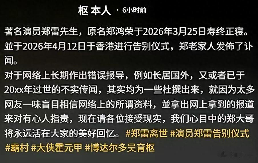 2026年4月13日,香港殡仪馆的灵车缓缓驶出,一代资深武打演员郑雷的人生正式落幕。