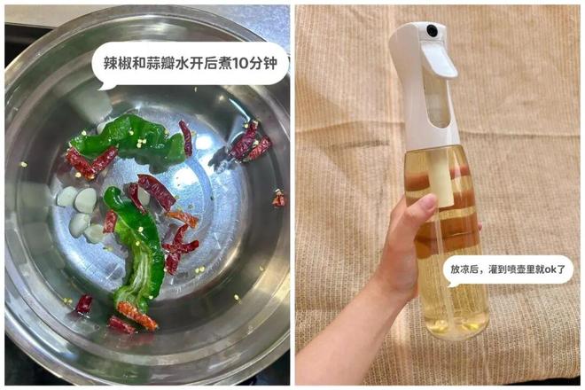 冷水下锅,放入7~8个干辣椒(辣的就行),两瓣蒜,水开后再煮10分钟,放晾后装入喷壶里。