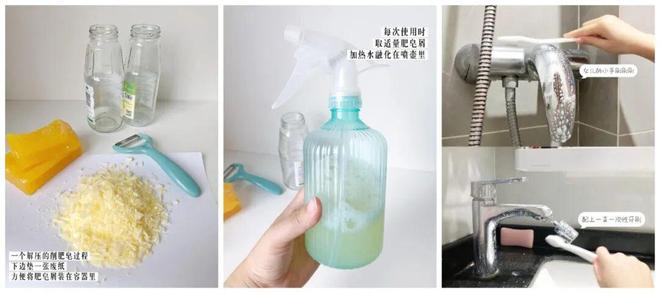 1)肥皂屑+热水,就是一瓶清洁剂,用它清洁花洒龙头,不仅去水垢效果好,还温和不刺鼻。