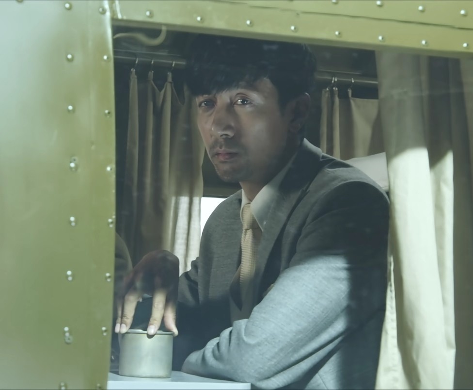 当他看到日本人有所动作时,眼神立马变得警惕起来,但当日本人坐在他的身旁,又多了几分玩味和松弛。