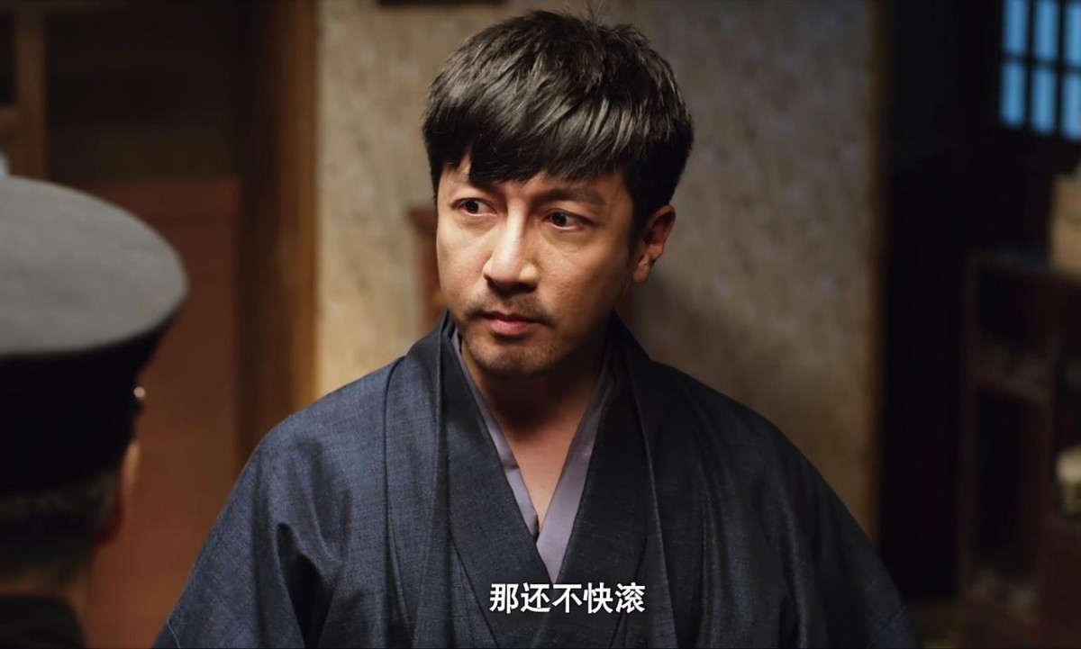 被日本人查验一番后,收起自己的证件,嘴角一抹嘲讽的微笑,眼神中三分凶悍,三分轻蔑,整个人很有压迫感。