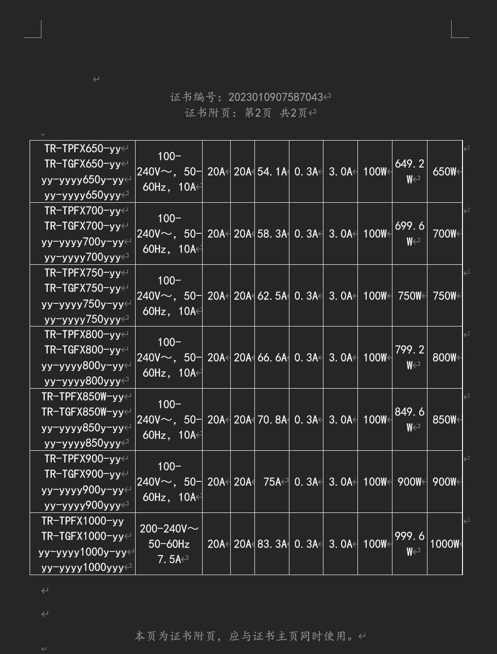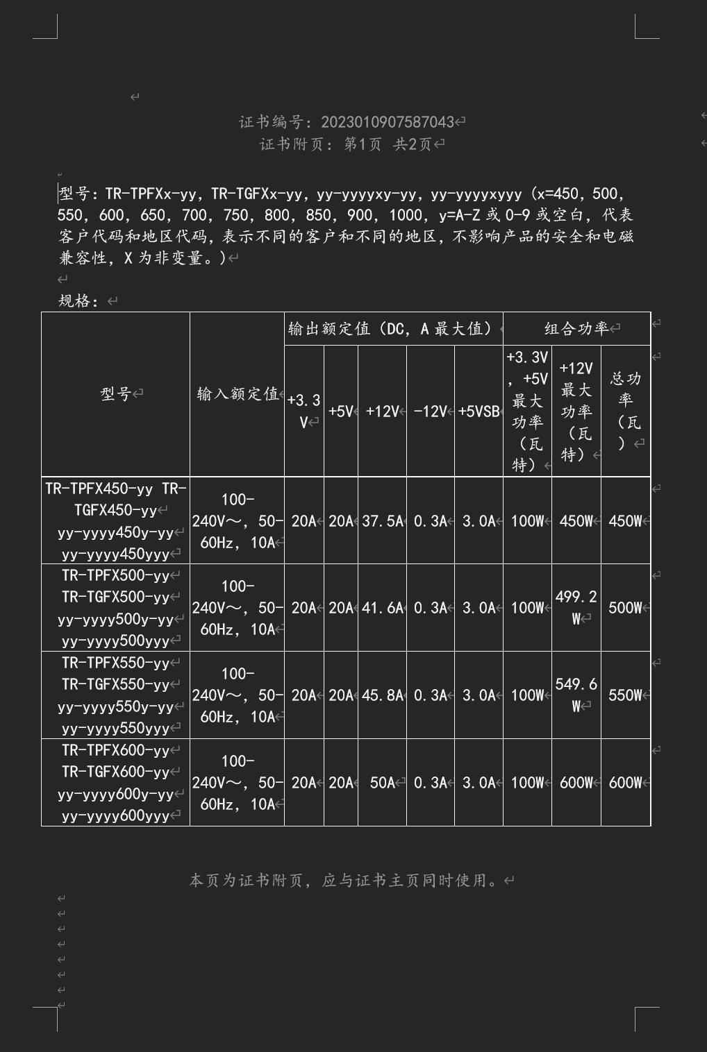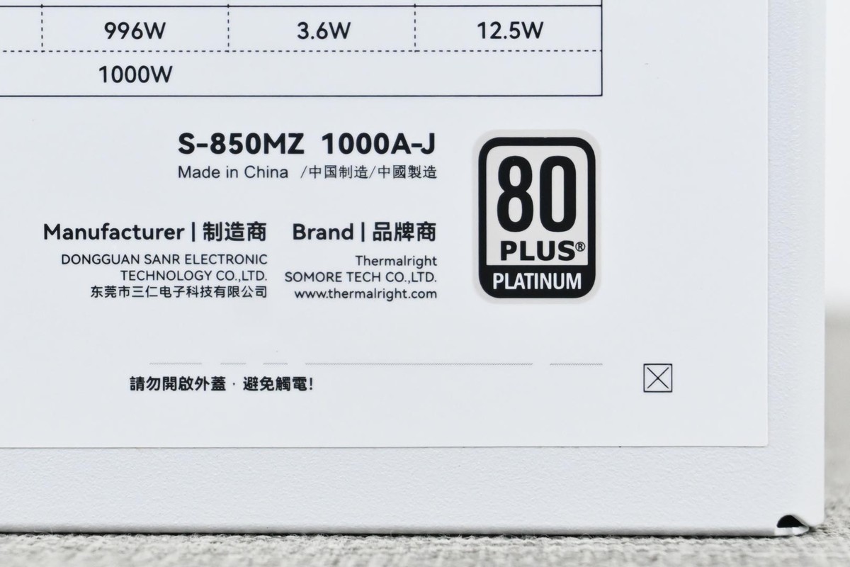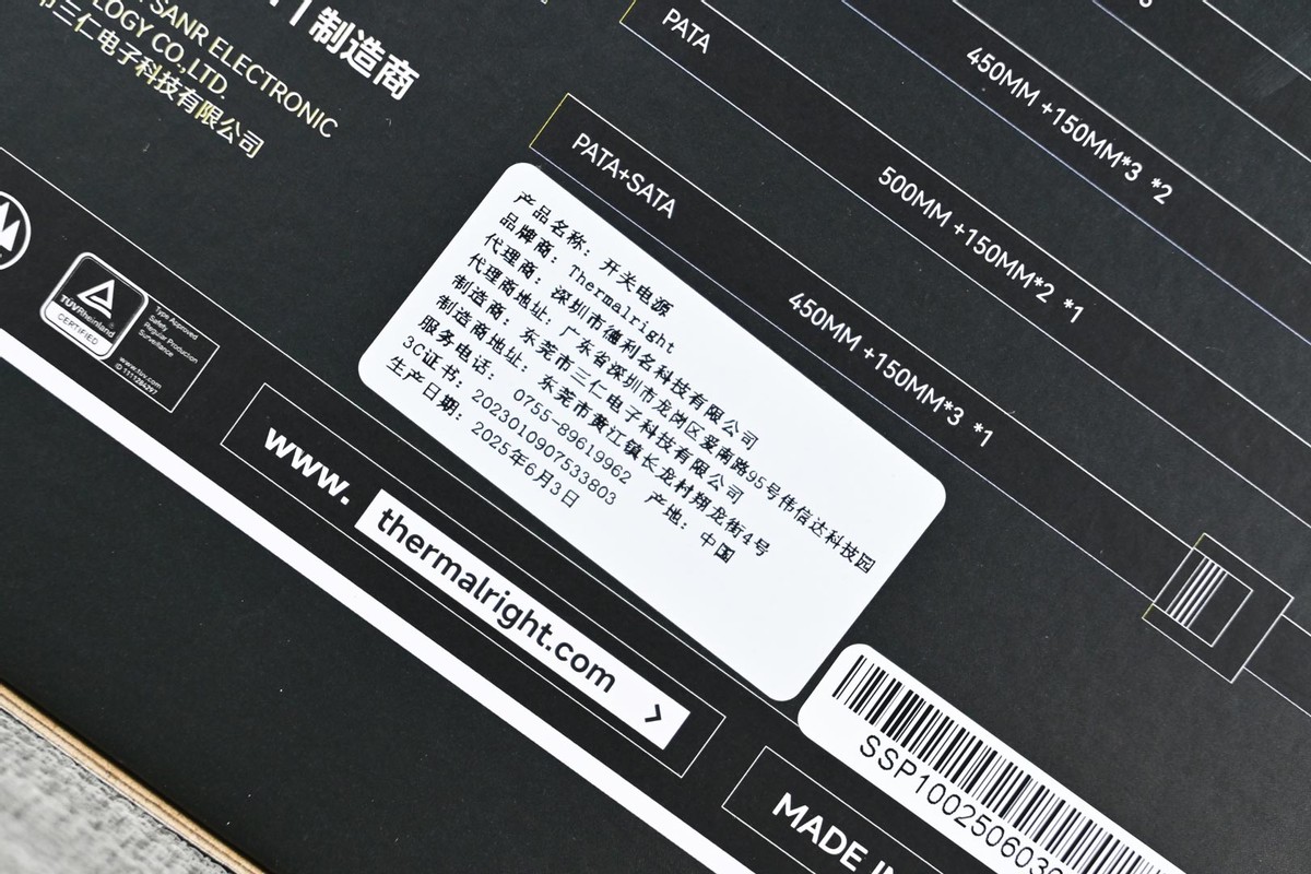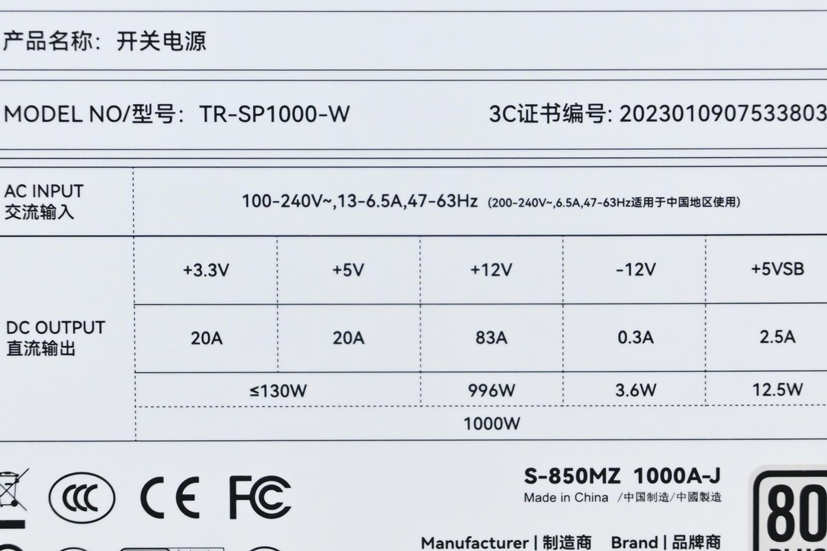 来到铭牌部分,SP1000电源产地为中国,SP1000实际型号为TR-SP1000-W,在3C认证信息亦采用该型号;SP1000是一款单路+12V的电脑电源,+12V标称输出能力为83A,从规格上来说,应对RTX5080+9950X/285K高端组合也是没有问题的。