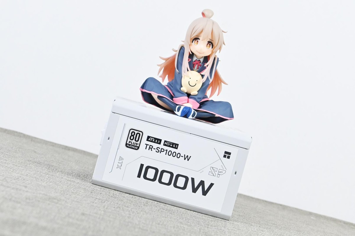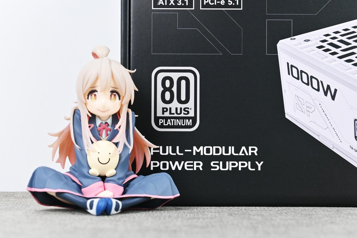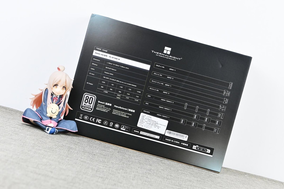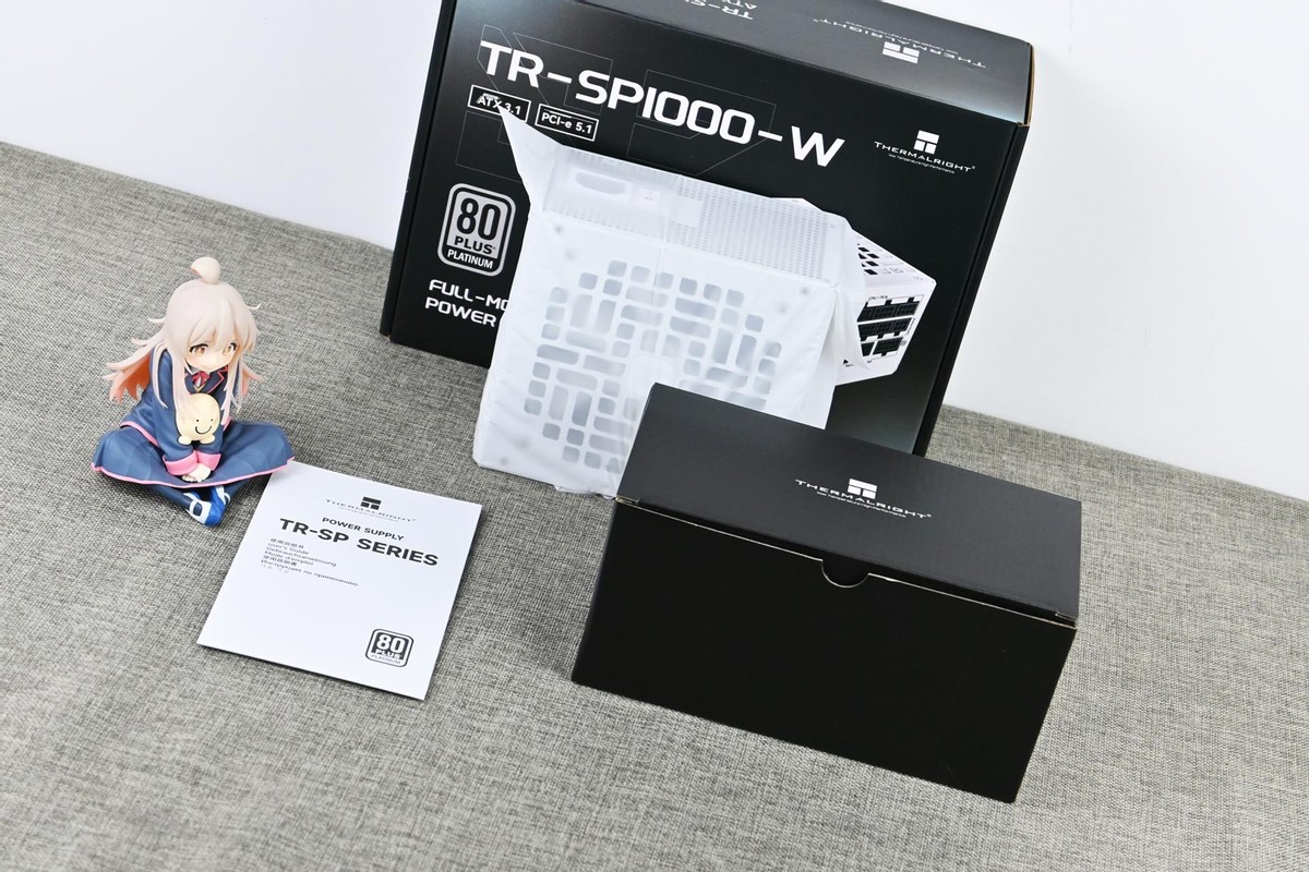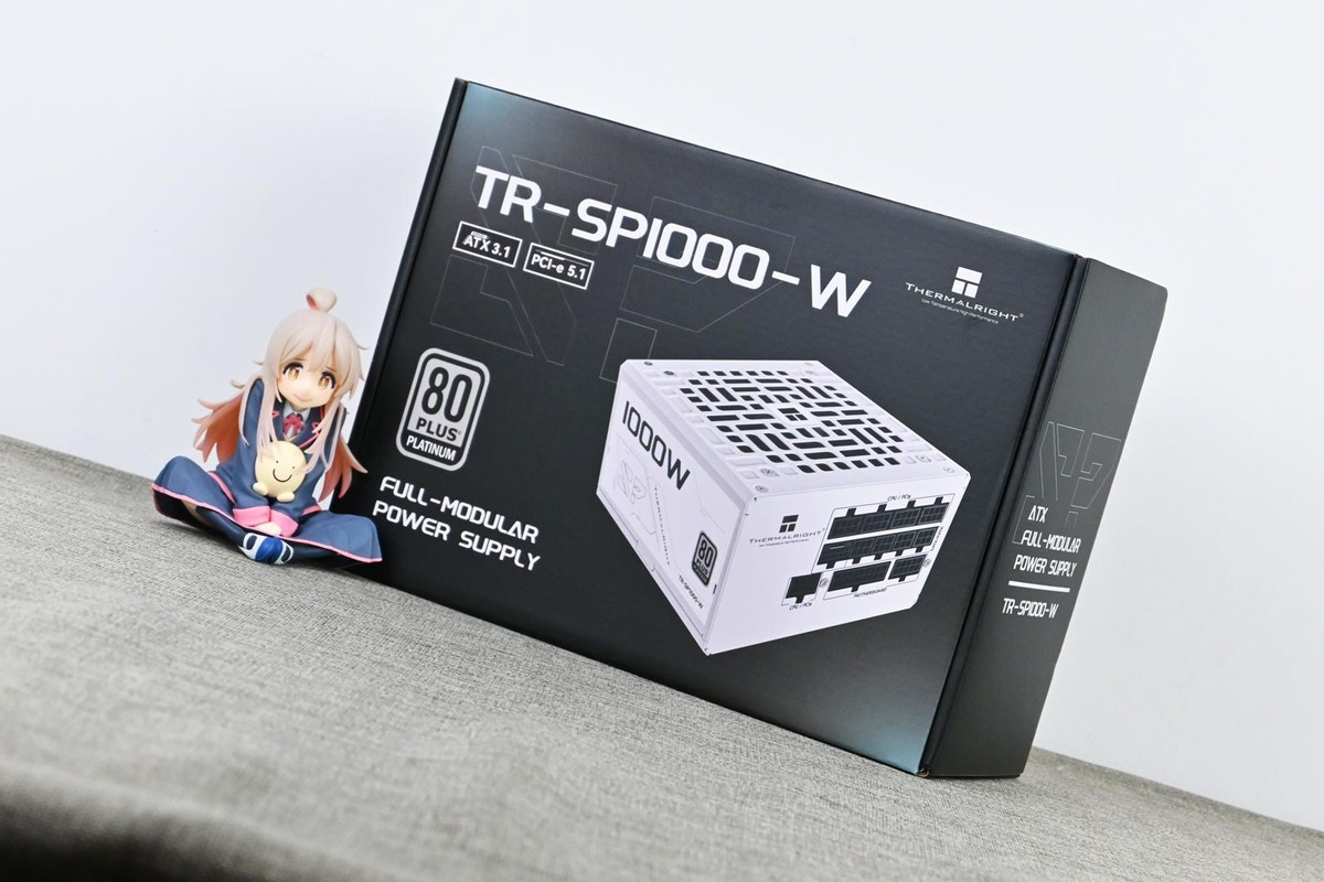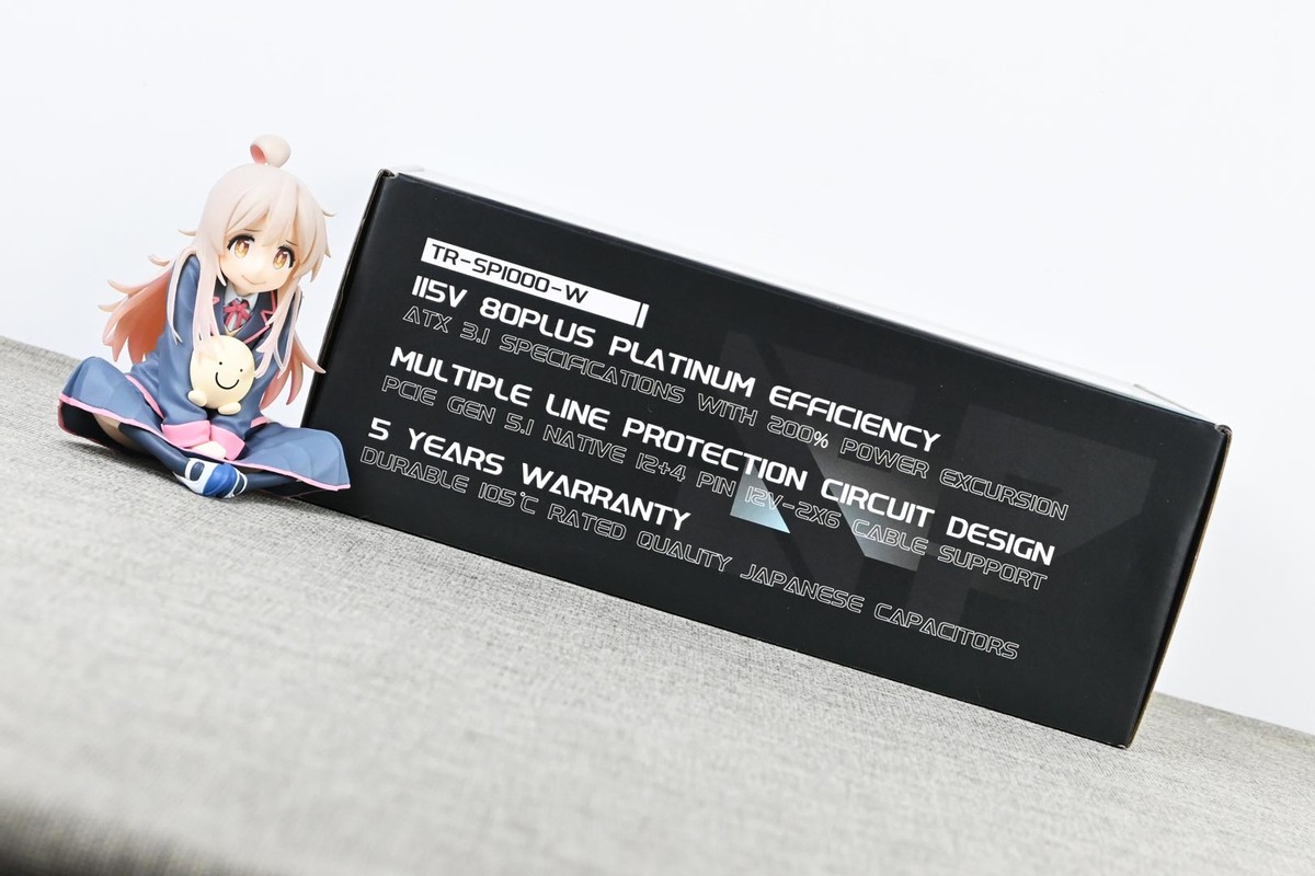 相较于此前的TG/TP系列简洁纯白风格,利民TR-SP1000-W白金效率ATX3.1全模组电源(下文简称“SP1000”)更换成纯黑彩包设计,包装信息依旧简明扼要,从上面可以看出,SP1000基于ATX3.1和PCIE5.1设计,具备80PLUS白金牌转换效率并使用105度日系电容,电源本身提供5年质保服务。