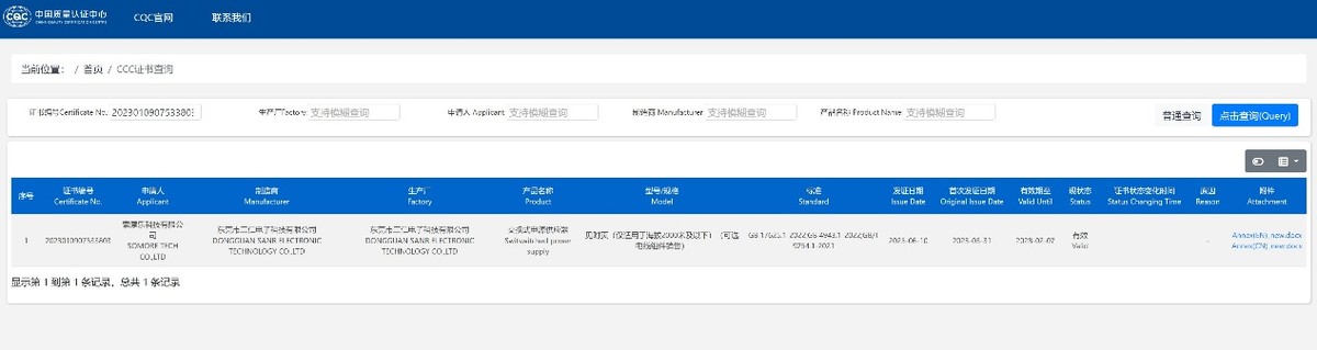 SP1000的3C证书号和TG/TP一致,为2023010907533803,证书申请人SOMORE索摩乐科技有限公司,而制造商和生产厂为东莞市三仁电子科技有限公司,发证日期2023年12月12日,有效日期至2028年02月07日,目前状态有效。