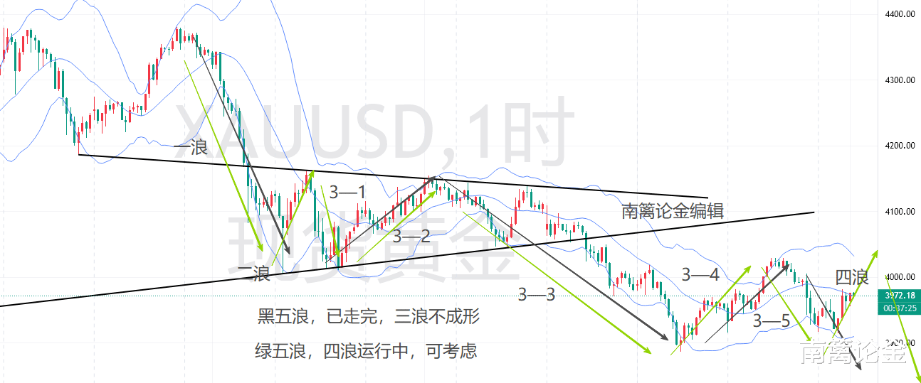 刚刚测算中换了个思路,把现在并不完全的三浪和四浪拆解一下,作为小时图上的3—1;3—2;3—3;3—4出现,此时的小②浪和小④浪基本就等长了。黄金昨天下跌不多,还没有小⑤浪的新低,但是勉强这样成型也行,不高于昨天的4030就OK。三浪成型,四浪的反弹中,如果还有新低,则关注在3845—25内的情况;反之,这样走,阻力可就得重现4073,怪为难人的。