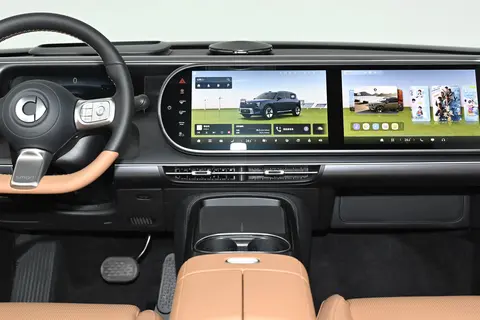 smart精灵#5 EHD超级电混2026 120Pro版的智能座舱部分搭载的是smart OS 2.0系统,中控是10.3英寸液晶仪表加双13英寸OLED屏幕组成的三联屏布局,屏幕显示很清晰,阳光直射的时候也不会反光。里面有AMD V2000高算力芯片,性能近2倍8295芯片,反应速度很快,切换界面、打开应用都挺顺畅,基本没有延迟,而且它的车机系统内存及车机系统存储有24GB+256GB,相当于智能手机的存储能力。