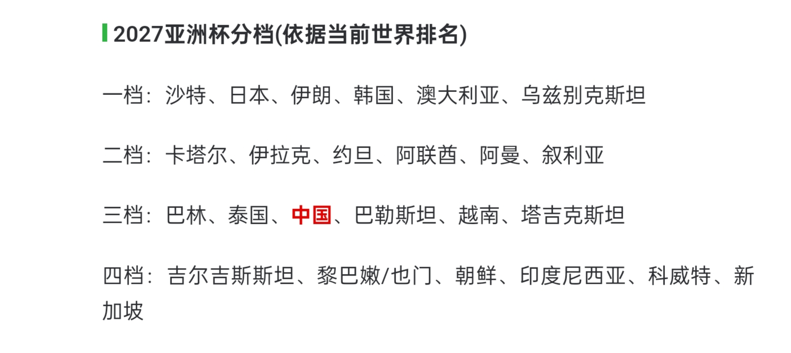 根据FIFA最新一期的国家队排名情况,国足会以第3档球队身份进行分组抽签。可仔细看下参赛球队以后,咱们会发现:无论国足抽到哪3个对手,都可能会进入死亡之组,抽谁都会是下签。按照2027亚洲杯分档情况,沙特、日本、伊朗、韩国、澳大利亚、乌兹别克斯坦6队是第1档球队,卡塔尔、伊拉克、约旦、阿联酋、阿曼、叙利亚6队会是第2档球队,吉尔吉斯斯坦、黎巴嫩或也门、朝鲜、印度尼西亚、科威特、新加坡6队会是第4档球队。