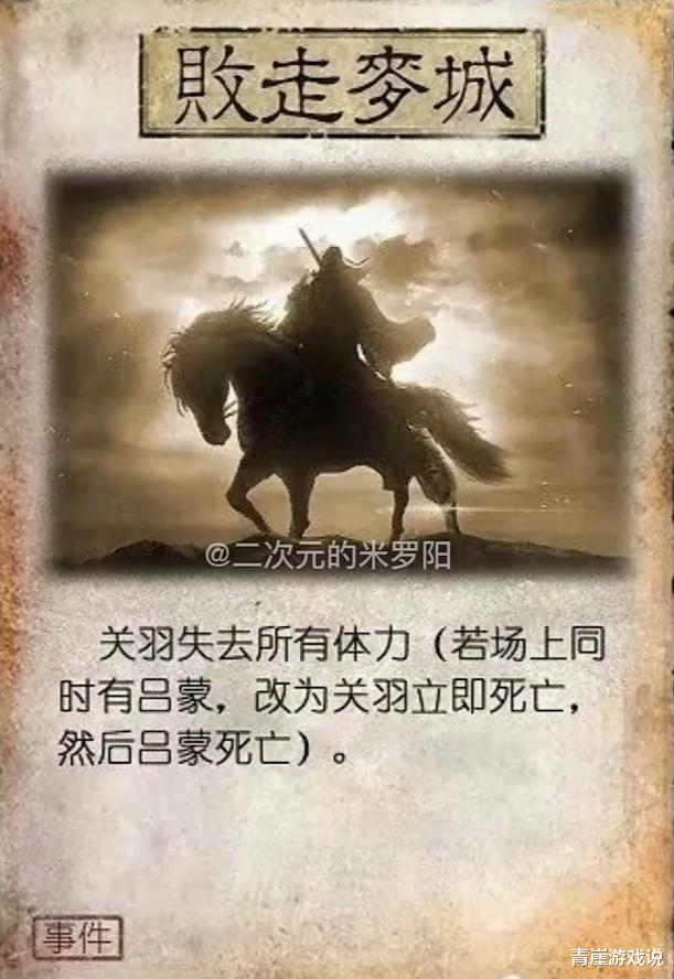 败走麦城是三国的一场悲壮的事件,作为主角的关羽受到迫害,而最后通过追魂索命,吕蒙也不得善终。在三国杀事件卡中则是针对关羽与吕蒙的事件卡,他们两个都会立即死亡!