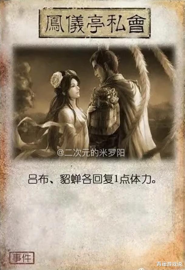 凤仪亭是吕布和貂蝉爱情的开始,在三国杀事件卡中,这两位主角各回复一点体力。