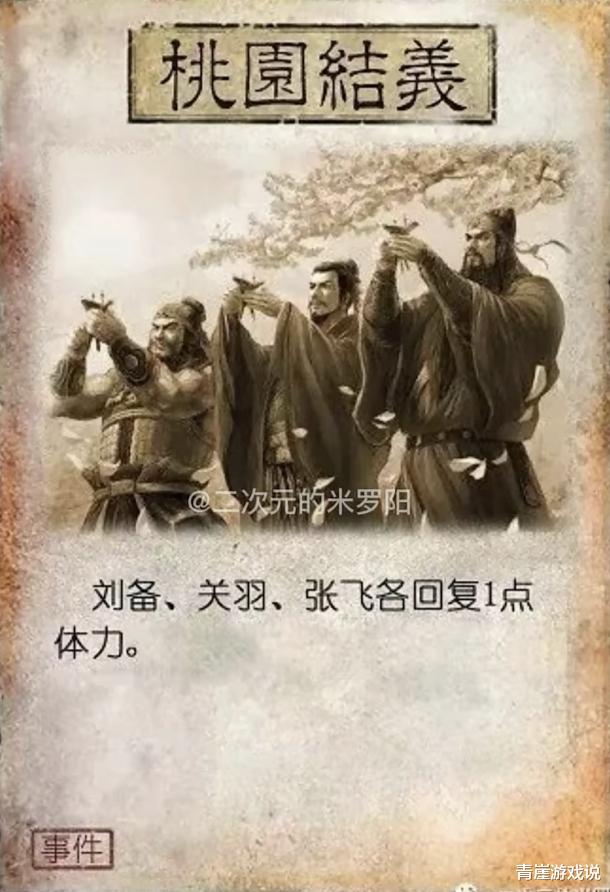 桃园结义的故事千古流传,人尽皆知。而作为三国杀的事件牌,给予三位当事人回血的能力,正和锦囊牌桃园结义相同,只是人数进行限制。