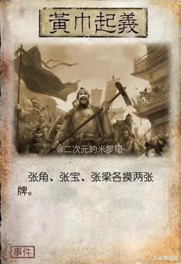 三国时代的标志性开始事件是黄巾起义,而黄巾起义人数众多,领导者是张氏三兄弟。黄巾起义这张卡牌只对事件的领导者生效,三兄弟一起摸牌,还是不错的。
