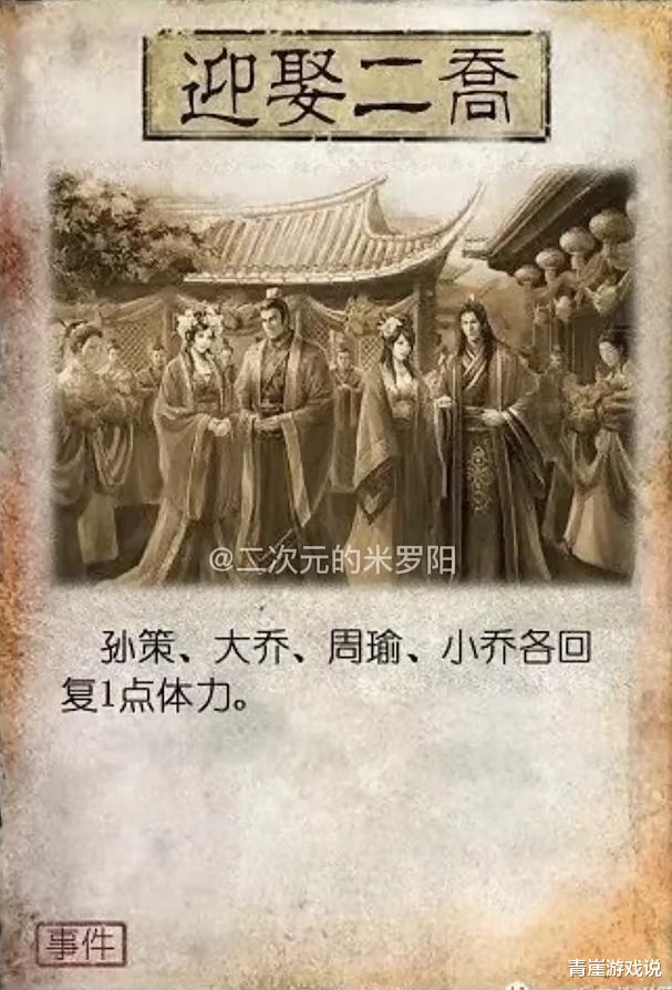 迎娶二乔虽然没有凤仪亭私会那么出名,但江东人才也有自己的春天。这四位是迎娶二乔的主角,而作为事件卡的四位主角发动后会各自回复一点体力。
