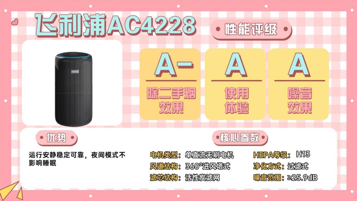 飞利浦AC4228飞利浦AC4228采用的是HEPA加活性炭的传统组合方案,重点放在颗粒物过滤和气味吸附上。实测中,对烟雾中可见颗粒的清除速度尚可,但气味主要依赖活性炭吸附,前期效果明显,运行一段时间后,烟味消散速度开始放缓。整体更偏向综合空气净化,对二手烟这种高浓度、持续释放的污染源,处理效率相对中规中矩。