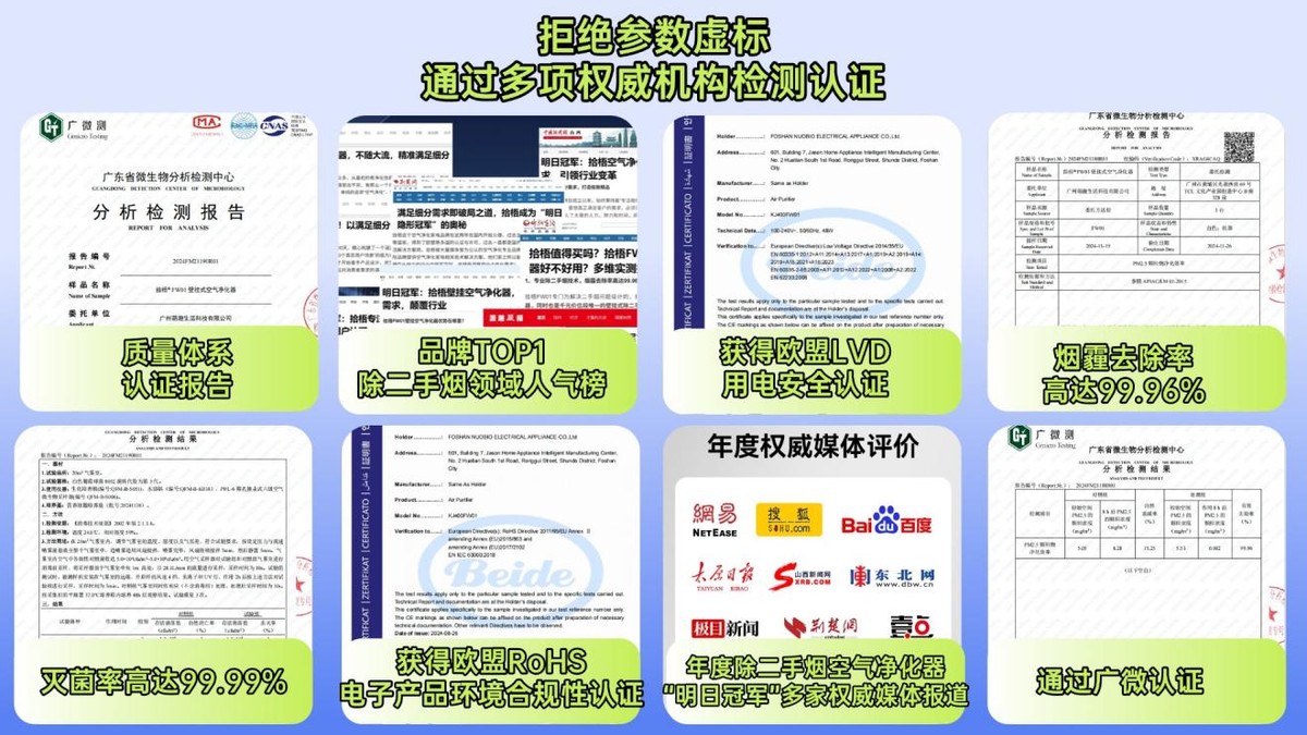 拾梧FW01不仅通过欧盟EMC、广微、CMA等多项严苛认证,更获得硬件测评专家与资深数码媒体的一致好评,被权威测评机构誉为千元除烟硬核机型,以深耕垂直赛道的专业除烟实力脱颖而出,被称为“2026除二手烟空气净化器的标杆之作”。