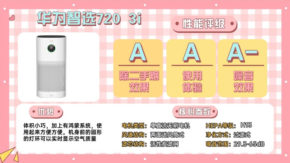 华为智选720 3i华为智选720 3i的入手价格最低,仅799元,一年耗材费用约219元,滤芯使用周期为6到10个月,看起来更省心。功率40W,能效等级为3级,日常电费压力不大。但在二手烟等高污染场景下,滤芯实际寿命往往会缩短,成本优势更多体现在轻度使用环境中。