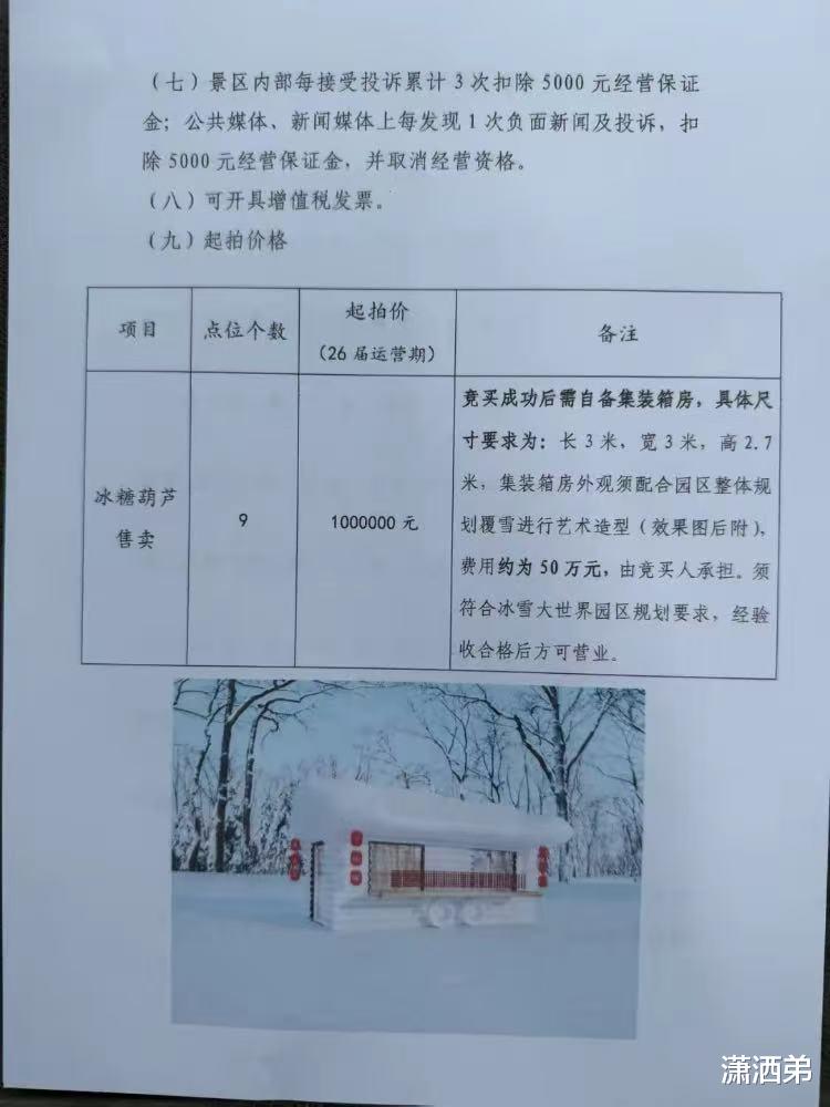 最近哈尔滨冰雪大世界糖葫芦摊位售卖点起拍价100万引起了网友们的关注。这个你拍下来之后,你还只是有一个地方给你摆摊而已。对于摊位的集装箱你还得自己准备,尺寸也要求。长和宽是3米,高2.7米。后面你还得经过工作人员的审核,确认没问题才可以开始营业。然后你还需要再交50万元装修雪景的费用。