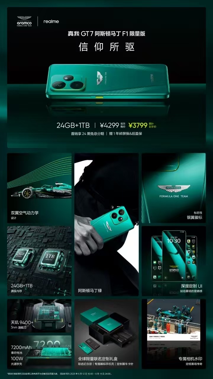 来回顾一下今年6月12日,realme推出的真我GT7阿斯顿马丁F1限量版。官方为该机推出了全球限量联名定制礼盒,为该机配以冠军荣耀色「阿斯顿马丁绿」,标志性银翼徽标,双翼空气动力学设计纹理,致敬追求极致的赛道精神,官方为该机深度定制了UI,包括阿斯顿马丁F1开机动画、动态壁纸、充电动效及专属相册水印等,配置方面,该机搭载联发科天玑9400+旗舰处理器,配备24GB+1TB满级存储组合,内置7200mAh泰坦电池,支持100W光速秒充。同时,官方还为该机带来了全球限量联名周边产品,包括联名纪念册、专属徽标手机壳、定制赛车卡针等。