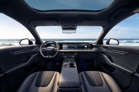 内饰方面的升级同样可圈可点。进入车内,环抱式座舱设计更加人性化,所有操作按钮触手可及。屏幕系统配备27英寸W-HUD抬头显示、12.3英寸仪表盘、15.6英寸悬浮式中控屏及17.3英寸低蓝光护眼娱乐屏,部分信息显示可能采用1.1米贯穿式智联屏,搭载SYNC+智享互联系统,支持手机投屏(CarPlay)及驾驶辅助功能集成。标配高通骁龙8155芯片,配合全新STR快速启动技术,车机启动仅需2秒即可进行语音交互,智能语音系统融入了大语言模型,能够更准确地理解自然语言指令。实测中,即使是“我有点热而且想听周杰伦的歌”这样的复合指令,系统也能准确识别并同时调低空调温度和播放对应歌曲。540°全景影像带透明底盘功能非常实用,支持3D车模环绕显示及陡坡视野辅助,能有效消除视觉死角,在狭窄路段停车或越野时特别有用。换挡区域升级为镂空悬浮式岛台结构,新增双手机无线充电座,提升实用性。中控台及门板等处大量使用软质材料包裹,辅以金属拉丝饰板或木纹饰板,部分车型配备B&O音响及氛围灯,提升档次感。座椅材质采用SUPERIOR环保仿真皮+仿麂皮绒拼接,支持10向电动调节;高配车型可能配备真皮座椅,填充柔软且支撑性良好,部分版本支持加热功能。最令人惊喜的是,即使是新车,车内也几乎闻不到任何异味,福特在环保材料使用上的用心可见一斑。