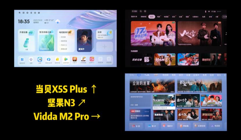 当贝X5S Plus内置的是全新的当贝OS5.0系统,开机和投屏均无广告,并且支持桌面自定义,以及开机自启第三方软件,自由化程度比较高,且界面简洁大方,操作简单方便,资源也十分丰富。坚果N3内置的是Bonfire OS7系统,界面比较酷炫,上手有一定难度。Vidda M2 Pro内置的则是JUUI 7.0系统,界面采用的是传统的瀑布流,操作相对繁琐一些。