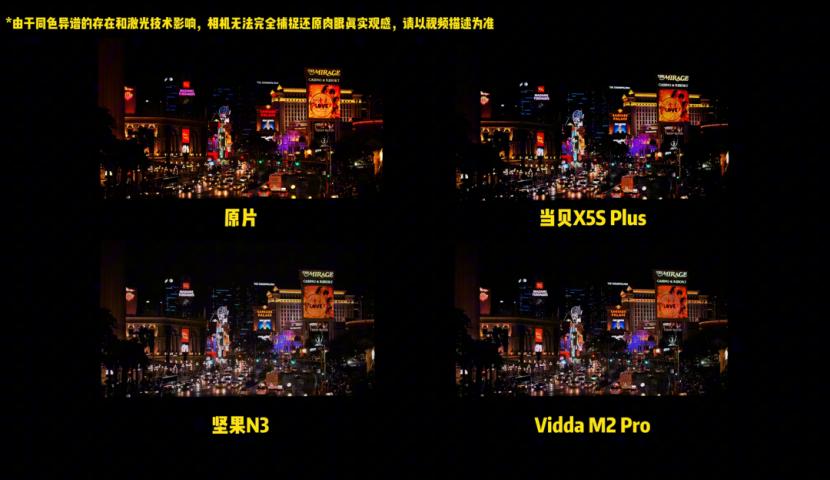 光源方面,当贝采用的是ALPD3.0双色激光,这项技术已经比较成熟了,特点就是亮度高,无散斑和色边。坚果和Vidda采用的则是纯三色激光,特点就是色域广,但是亮度受限,且存在天然的散斑和色边问题,目前还不能做到百分百的消除。